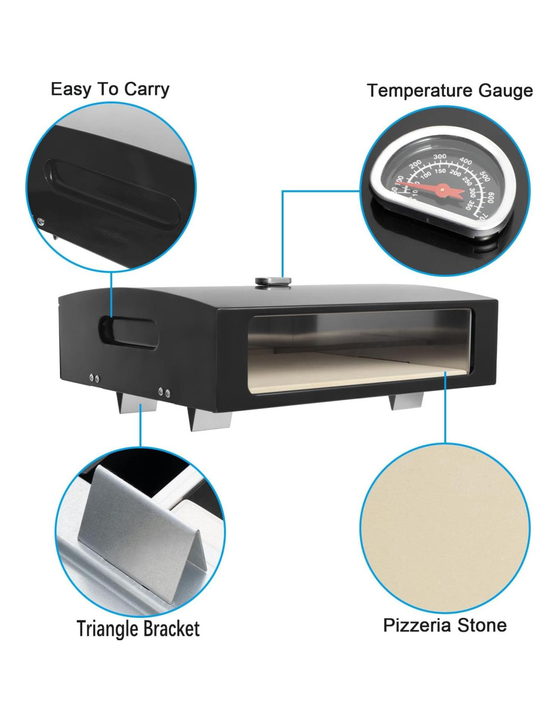 - [Kit de Accesorios Completo] Incluye todo lo necesario para resultados profesionales: piedra para pizza removible, paleta de pizza de aluminio, termómetro de precisión y soporte estabilizador de cuatro patas. Este paquete esencial eleva tu experiencia de cocina al aire libre.