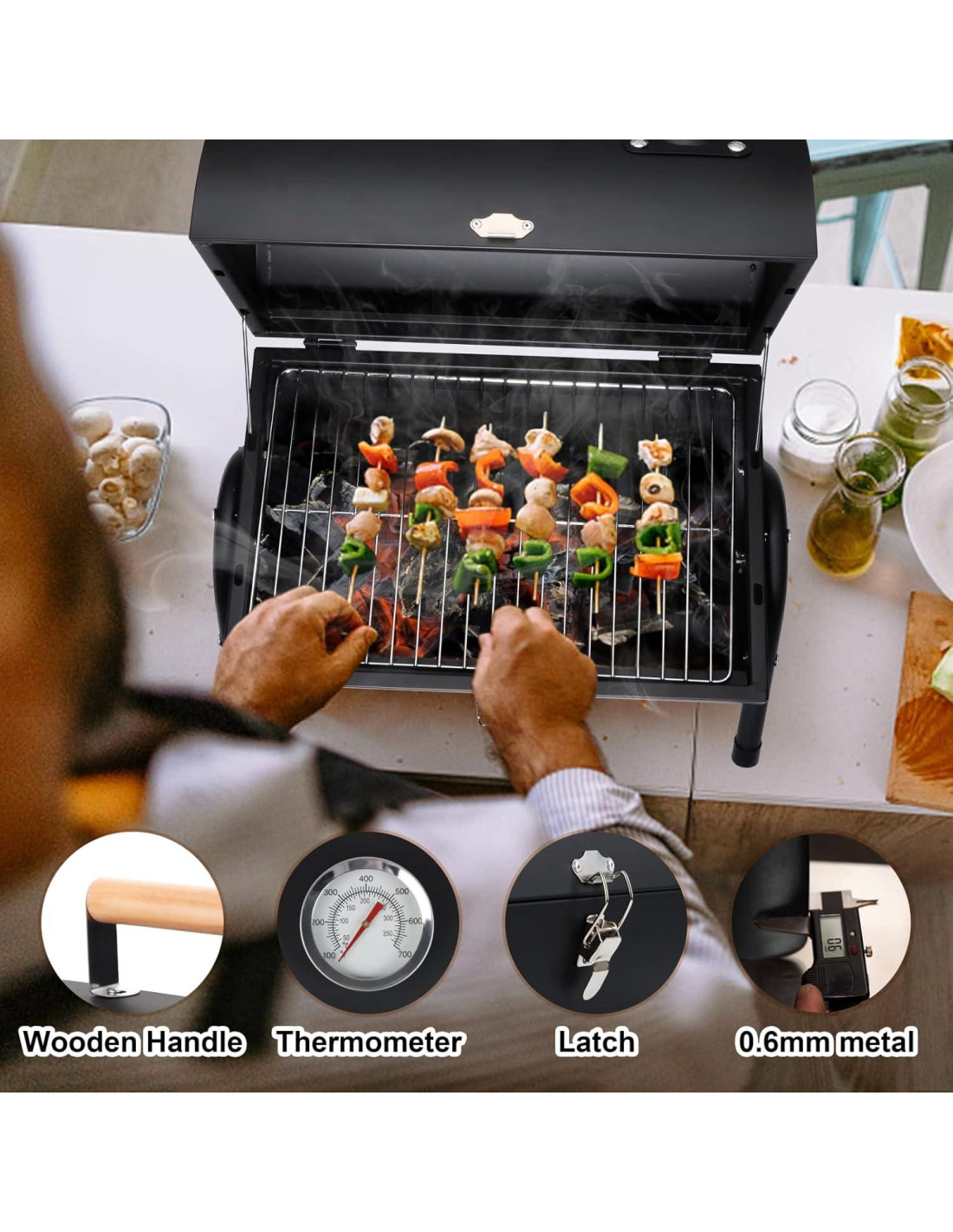 - [Particularidades de Construcción] - Ambas patas de soporte triangulares refuerzan la solidez de la parrilla de carbón, de pie en el suelo, mesa, césped más estable sin tambalearse, cierre de bloqueo reforzado hace que sea fácil abrir o cerrar la tapa, y no se abrirá cuando la levantes, muy portátil para llevar al aire libre, la tapa de la parrilla es sostenida por 2 varillas de tracción para función a prueba de viento, mango de madera suave recubierto con aceite brillante sin astillas