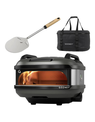 Este paquete incluye el Horno de Pizza Portátil Gozney Tread, Negro Mate, Gas Propano, hace pizza de 12" (30.48 cm) & Bolsa Tread Venture & Paleta Giratoria Venture para Horno de Pizza Portátil Tread, 25.25" (64.14 cm) de Largo con una Cuchilla de Acero Inoxidable de 6" (15.24 cm) de Ancho y un Mango de Madera de Haya