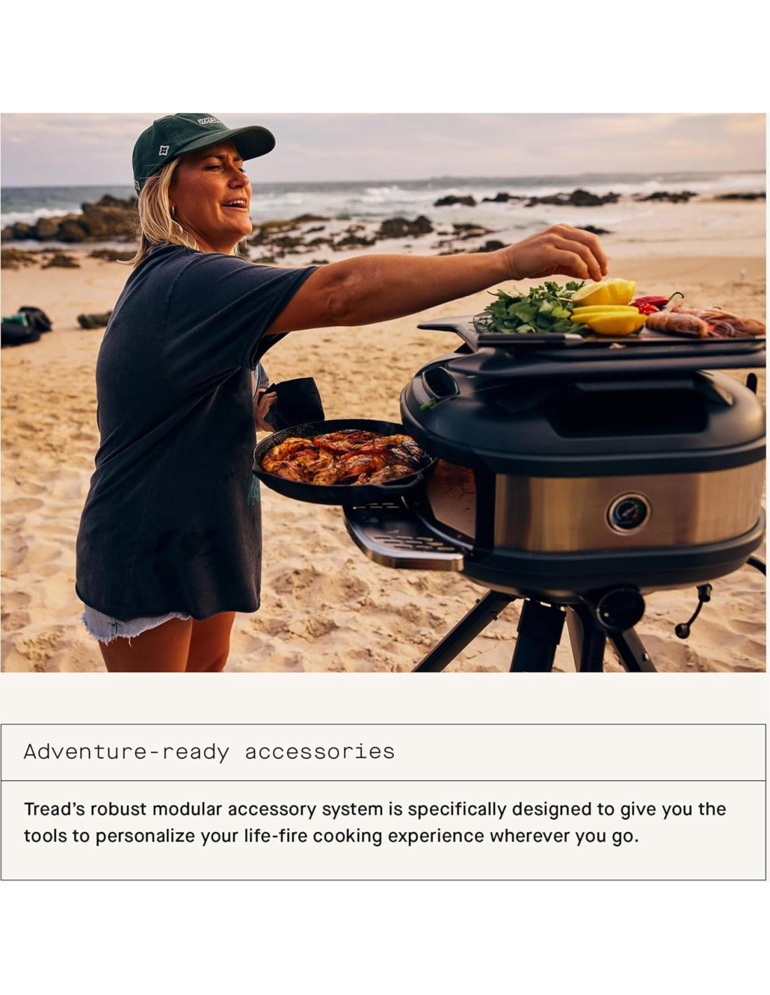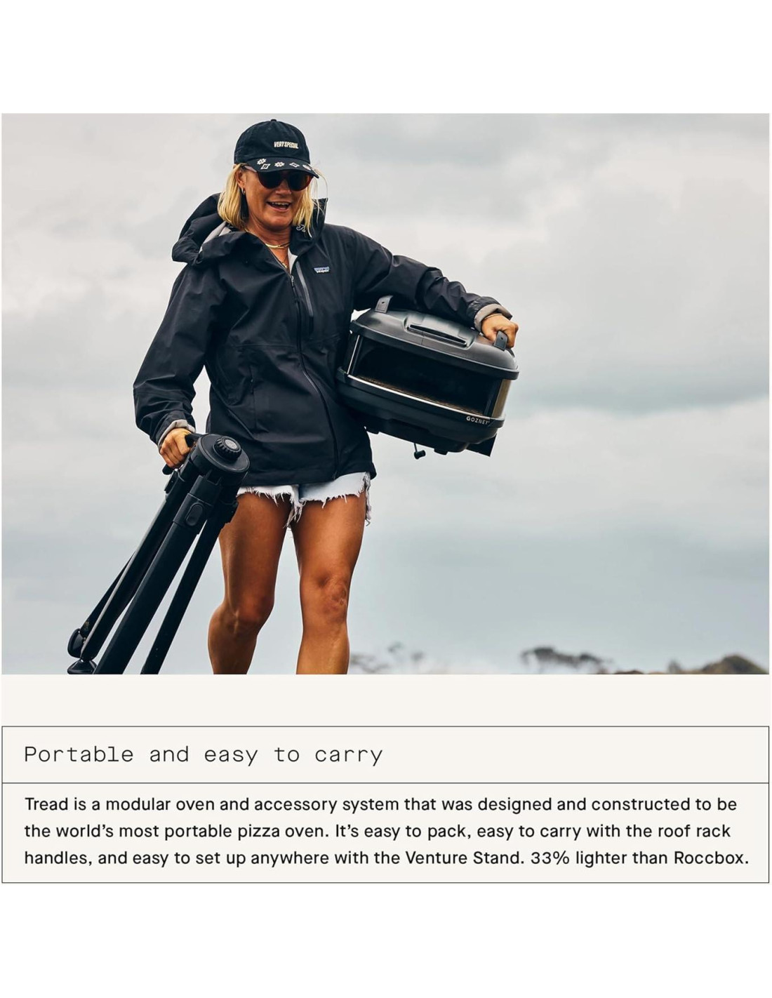 - Diseño portátil y ligero. Tread es un sistema modular de horno y accesorios que fue diseñado y construido para ser el horno de pizza más portátil del mundo. Es fácil de empacar, fácil de llevar con los mangos de portaequipajes y se puede instalar en cualquier lugar con el Soporte Venture. 33% más ligero que Roccbox