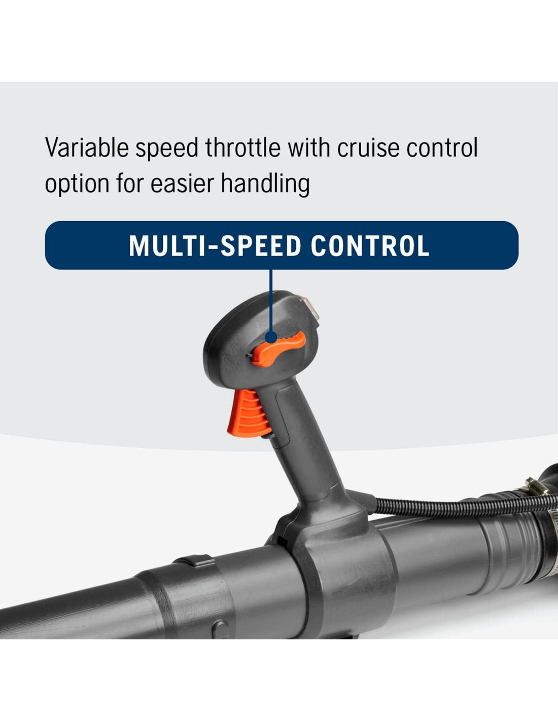 - Fácil Operación: el sistema de purga de aire elimina el aire del carburador y del sistema de combustible para un arranque sin problemas, además el acelerador de velocidad variable con control de crucero permite una fácil operación sin necesidad de regular la velocidad del soplador