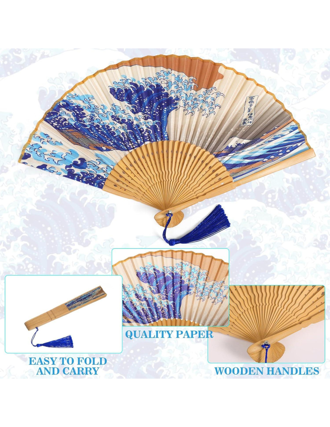 - Materiales Premium: Elaborados con bambú y seda de alta calidad, estos abanicos ofrecen durabilidad y elegancia. El bambú proporciona resistencia y un acabado lustroso, mientras que la seda añade un toque lujoso. Cada abanico viene con un delicado fleco y una funda protectora de seda.