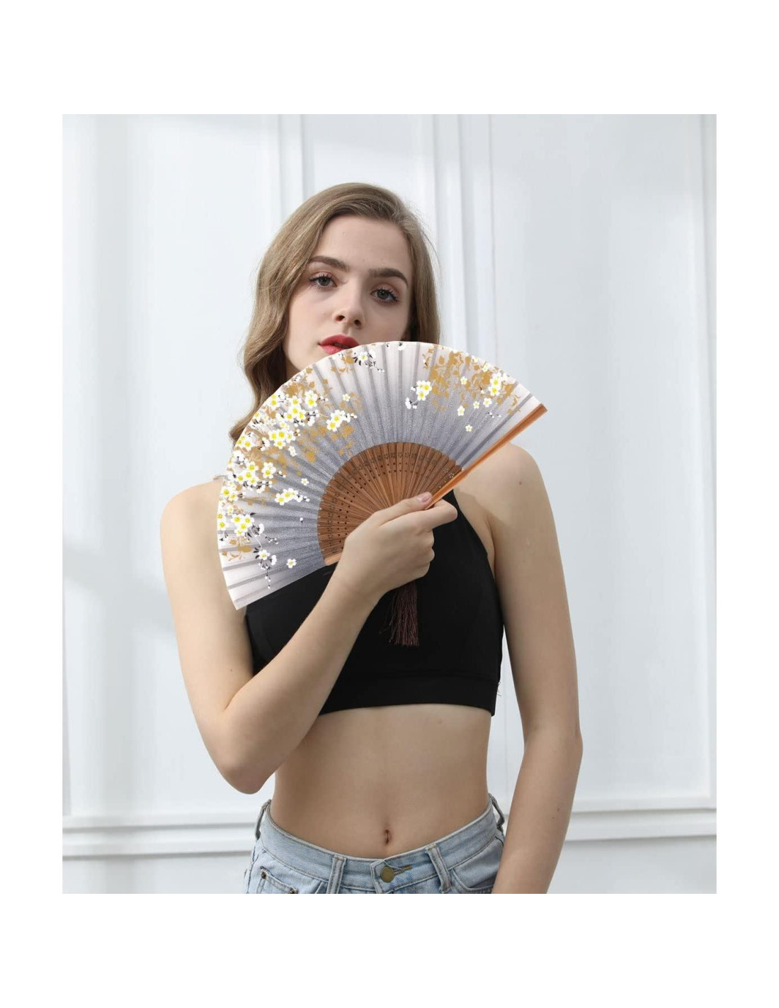 - Material: Hecho a mano, hecho de telas de seda y marcos de bambú de primera calidad. Cada abanico plegable está adornado con un elegante borlas y fundas de seda hechas a mano, mantiene el abanico seguro y cerrado cuando no está en uso.