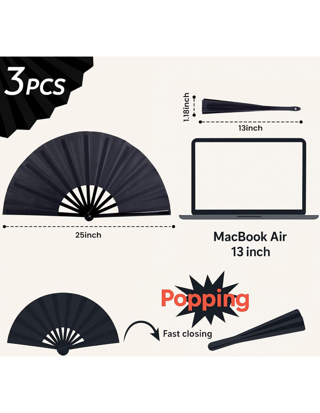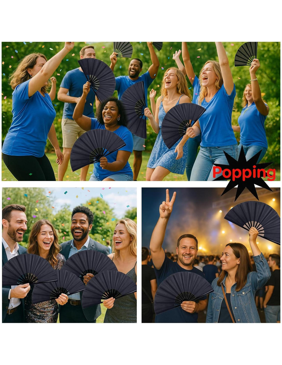 - Construcción de Tela Duradera - Hechos de tela negra reforzada con costillas de plástico resistentes, estos abanicos están diseñados para un uso duradero - ya sea en conciertos al aire libre, ensayos de baile o celebraciones de fiestas.