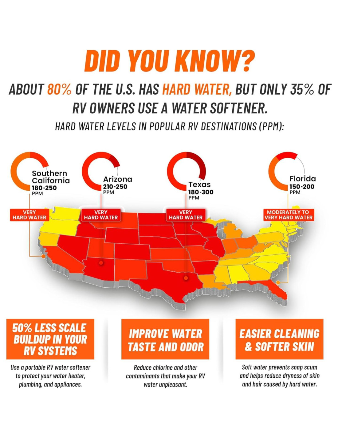 - AHORRA TU PIEL Y CABELLO - El agua dura puede afectar tu piel y cabello. Se sabe que contribuye a la piel seca y empeora diferentes condiciones de la piel, como el eczema, mientras que deja el cabello luciendo seco y opaco. Si tiñes tu cabello, el agua dura incluso puede quitar el color de tus mechones. El conveniente ablandador de agua portátil para RV te ayudará a proteger tu piel y cabello al ablandar el agua y prevenir la exposición adicional a metales como el hierro y el radio.