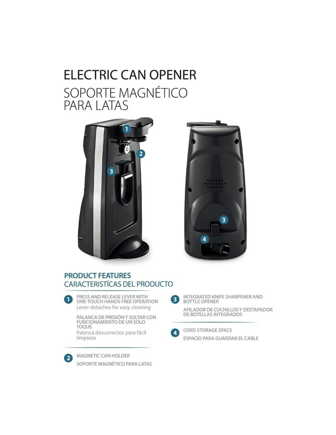 Detalles del producto Abrelatas Negro, 70W, 120V~60HZ 1) Cuchilla de acero inoxidable con palanca desmontable 2) Cabezal de corte desmontable 3) Abrebotellas incorporado 4) Cuerpo extra alto abre latas de diferentes tamaños desde pequeñas hasta altas 5) Afilador de cuchillos incorporado 6) Almacenamiento de cable 7) Función de seguridad de parada automática. Rápido y conveniente: Ahorra tiempo mientras cocinas con este esencial de cocina que te ayudará a abrir latas en poco tiempo y sin esfuerzo. Limpieza sin complicaciones: Nuestro pequeño milagro está equipado con una cuchilla de acero inoxidable desmontable y apta para lavavajillas que facilita la limpieza y el mantenimiento. Versátil y multifuncional: Este abrelatas eléctrico cuenta con un afilador de cuchillos incorporado y puede abrir rápidamente latas de todos los tamaños y alturas. Diseño compacto: Este increíble gadget pequeño viene con un almacenamiento de cable oculto para mantener tu encimera libre de desorden y organizada. Abrelatas Negro, pequeño electrodoméstico de cocina. 120V~60Hz~70W, el cable de alimentación negro está expuesto 66cm. El cuerpo es de moldeo por inyección rojo de alto brillo, motor de 70W. El producto tiene un tratamiento de hoja decorativa de acero inoxidable, la palanca del interruptor está moldeada por inyección en negro. La cuchilla y el engranaje de apertura de latas son de acero inoxidable. Hay una piedra de afilar en la parte trasera del producto. Cabezal de corte desmontable. Abrebotellas incorporado. POSIBILIDADES INFINITAS: Nuestro abrelatas automático es una potencia versátil y un gadget de cocina imprescindible. Con un motor de 70 vatios y una duradera cuchilla de corte de acero inoxidable, abre latas de todos los tamaños, desde pequeñas latas de atún hasta grandes tarros de tomate. MARAVILLA DE UN TOQUE: Los abrelatas cuentan con una mágica función de auto-giro para una operación fácil. Con un solo toque, observa cómo esas tapas vuelan mientras nuestro abridor se desliza a la acción sin esfuerzo. ALMACENAMIENTO CÓMODO: El almacenamiento de cable oculto del cuchillo eléctrico mantiene tu cocina libre de desorden y tu encimera ordenada, permitiéndote guardarlo cuando no esté en uso. LIMPIEZA FÁCIL: Limpiar es muy fácil con este abridor de tarros. La palanca de corte desmontable permite un fácil acceso, mientras que la cuchilla de acero inoxidable y el soporte magnético para tapas aseguran una experiencia sin desorden.