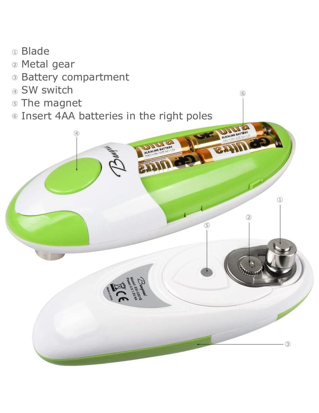 El abrelatas es una herramienta de cocina imprescindible para cada hogar. Un abrelatas eléctrico confiable te asegurará un buen trabajo cada vez que abras una lata. Actualmente hay abrelatas diversificados en el mercado. Algunos son operados manualmente. Otros son impulsados por energía. Para este tipo de abrelatas, la práctica común es rotar y cortar la tapa, dejando una tapa peligrosa y bordes afilados. El abrelatas automático Bangrui es una buena solución a tales problemas. Completamente diferente de los diseños convencionales, el abrelatas automático Bangrui abre latas a través de la presión interna, de manera inteligente y segura. Esto hace que tanto la tapa como el contenedor permanezcan intactos, asegurando un almacenamiento adecuado de los sobrantes. Fácil de operar: Retira la tapa de la batería de la parte posterior, instala 4 pilas AA, coloca el producto en su lugar y enciéndelo con solo presionar un botón. Ahora puedes liberar tus manos y verlo rotar automáticamente a 360 grados. Con otra presión del botón, dejará de rotar. 1: Cuchilla retráctil (inclinada) 2: Engranaje de metal 3: Compartimento de batería 4: Interruptor de encendido/apagado 5: Imán 6: Inserta 4 pilas AA en los polos correctos 7: Soluciones para problemas del abrelatas: A. Verifica la capacidad de las pilas secas y reemplázalas por nuevas antes de presionar la tecla de inicio. B. Cuando el abrelatas gira vacío y no corta la lata, verifica si el abrelatas está apuntando a la posición correcta antes de presionar la tecla de inicio. C. Verifica si las pilas están correctamente colocadas cuando el abrelatas no funciona. 1: Coloca el producto en su lugar, enciéndelo con solo presionar un botón y girará automáticamente. Ahora tus manos pueden estar completamente libres. Una vez que el trabajo esté hecho, puedes detenerlo con solo otra presión del botón. 2: El producto abre las tapas de las latas de manera segura, sin producir bordes afilados. Los usuarios tienen acceso a una tapa y un contenedor intactos, lo que asegura una buena hermeticidad. 3: El producto es aplicable a latas de diferentes tamaños (excluyendo latas sin borde, cuadradas, triangulares y de forma especial) 4: Es eficiente, simple, limpio y confiable. 5: Un artículo imprescindible de cocina para cada hogar; empaquetado en una caja de regalo.