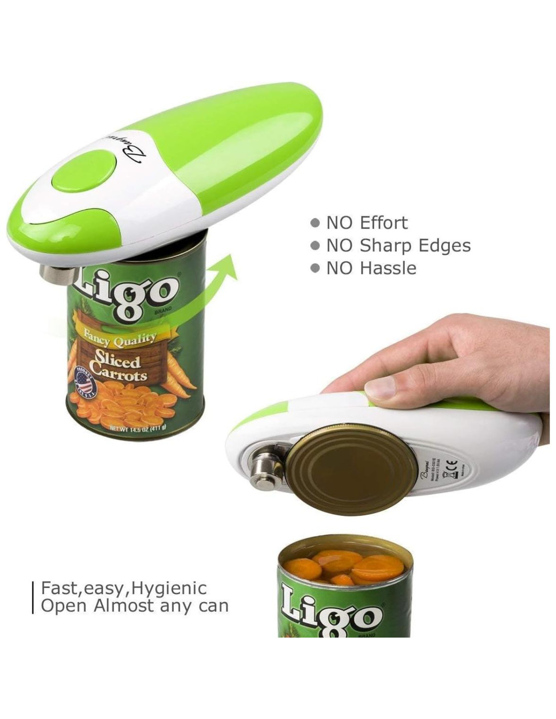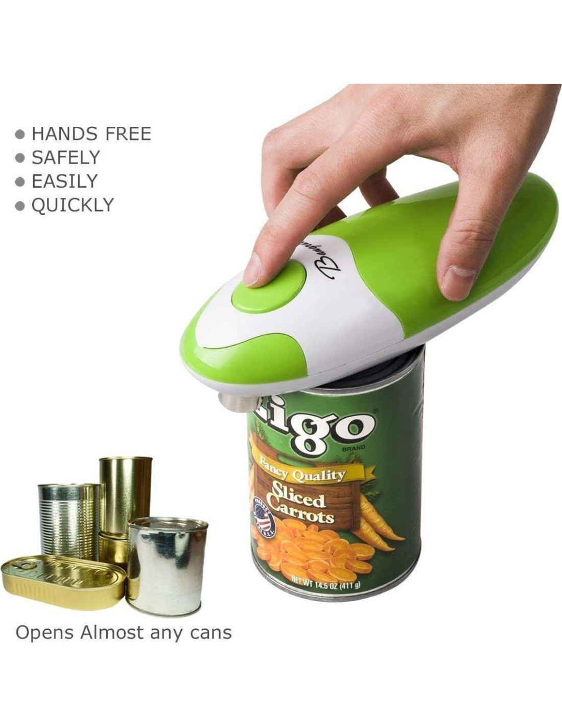 - El abrelatas utiliza la última tecnología para abrir la tapa liberando la presión del interior de la lata, lo que no deja bordes afilados, lo que significa un corte más seguro. Funciona en latas de diferentes tamaños (excluyendo latas sin borde y latas de forma peculiar)