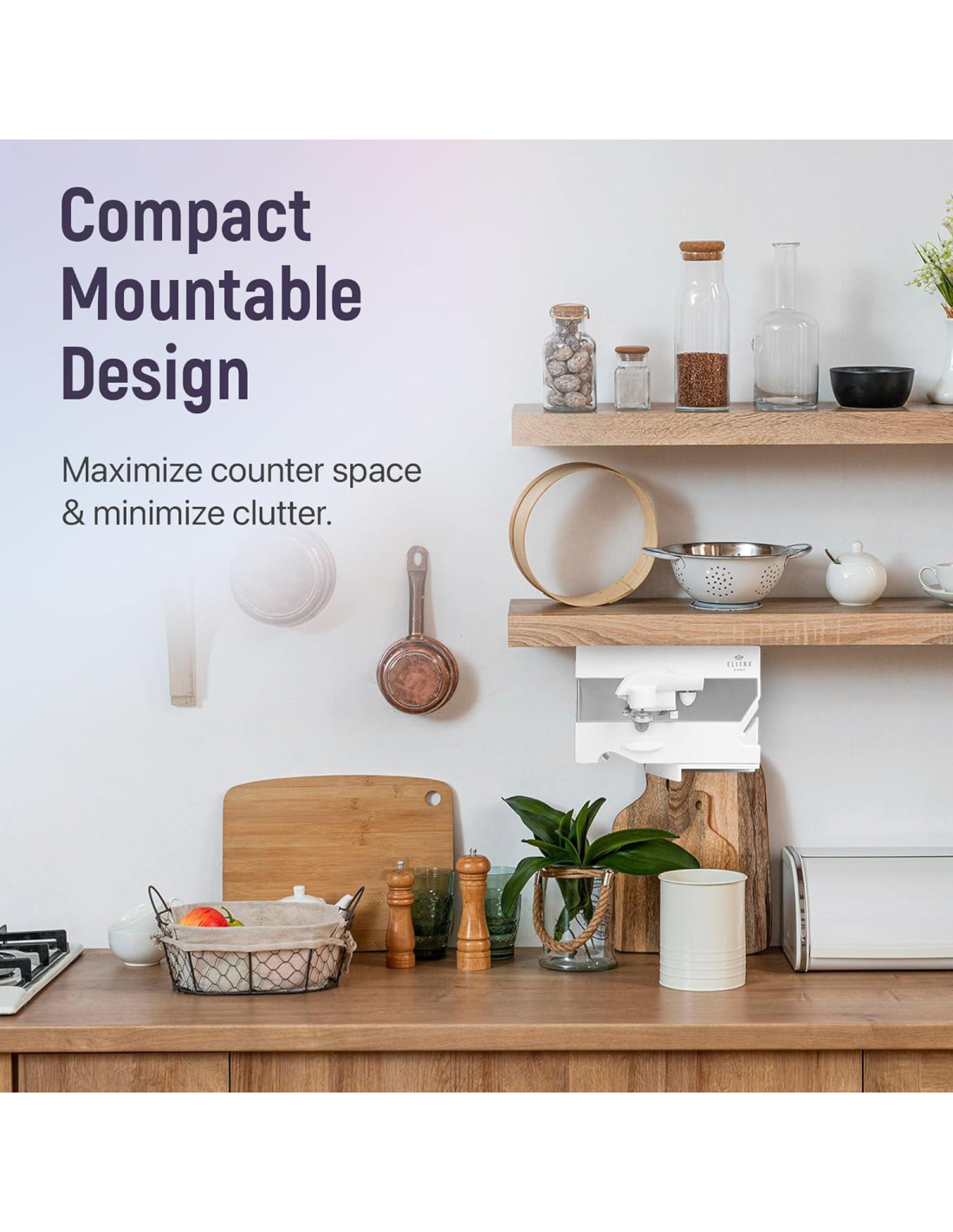 - Diseño Compacto y Elegante - Complementa cualquier decoración de cocina. Abrelatas montado fácilmente bajo el gabinete, ahorra espacio en el mostrador y lo mantiene ordenado. El cable de alimentación se almacena en la parte trasera de la unidad para que puedas usar la longitud exacta que necesitas sin desorden. Dimensiones: 7"W x 4.5"H (17.78 cm x 11.43 cm).