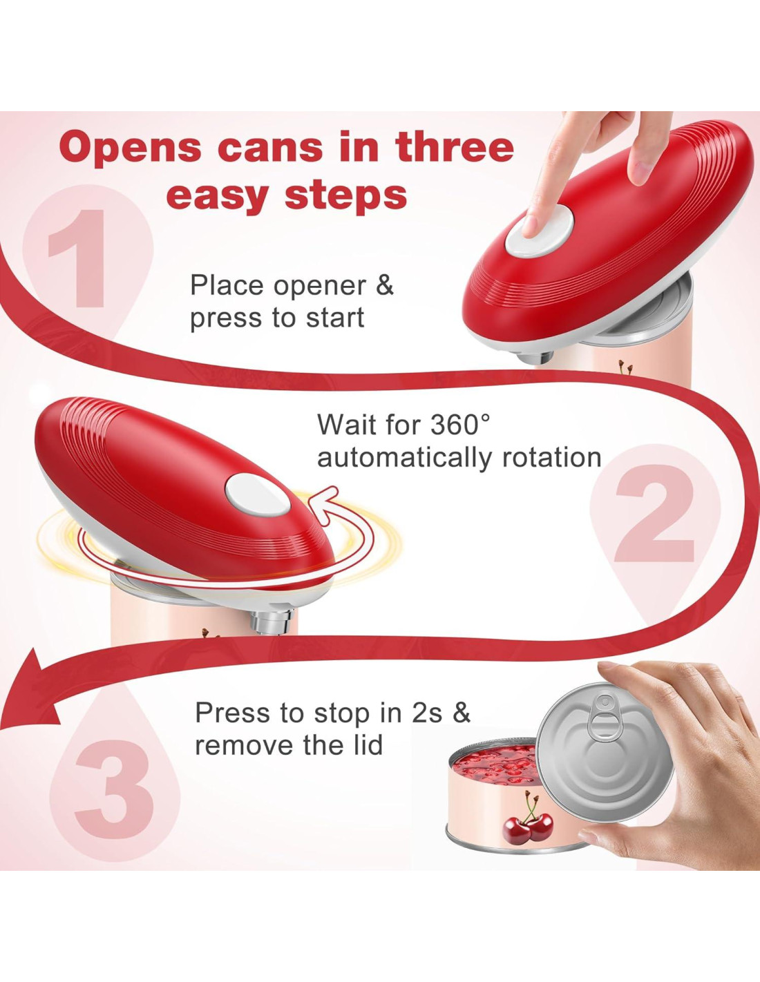 - [Fácil de Usar] : Simplemente coloca el abrelatas eléctrico sobre la lata y presiona el botón para comenzar, el abrelatas cortará las latas 360 a lo largo de la tapa automáticamente, presiona el botón nuevamente para detenerlo, con él tanto ancianos como niños pueden manejar fácilmente las latas