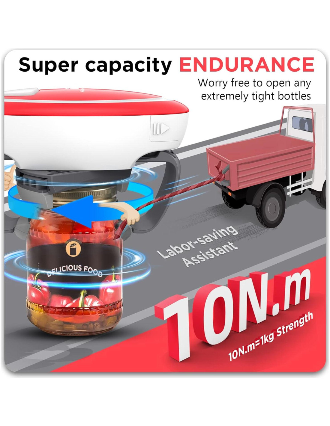 - [Alto Torque] Abridores eléctricos de frascos potentes mejorados pueden quitar las tapas de los frascos en 10s. Resuelve fácilmente el problema de abrir frascos.