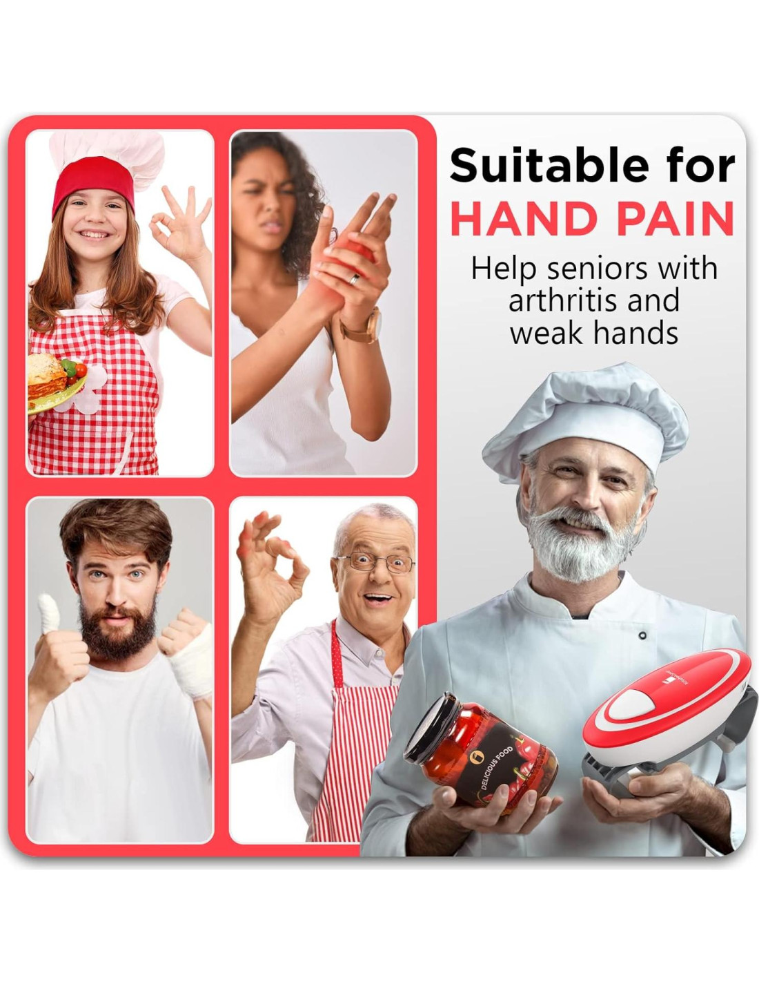 - [Operación con un toque] Solo presiona el botón durante 3 segundos, no es necesario sostener el abridor de frascos. Se agarrará y abrirá el frasco automáticamente por ti. Muy recomendado para personas que tienen problemas para abrir frascos debido a artritis, manos débiles u otras condiciones que dificultan el agarre.