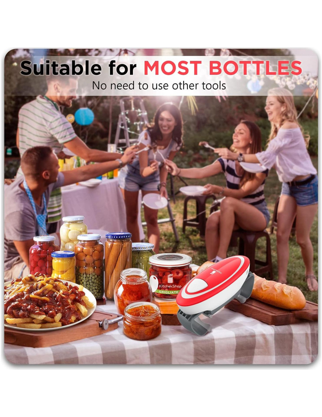 En Kitchek Shop, creemos que la tecnología debe simplificar la vida. Nuestro abridor de botellas eléctrico hace que abrir botellas sea rápido y fácil. El fundador creó este abridor después de ver a su madre luchar con la artritis, asegurando que sea fácil de usar para todos. Ahora es un imprescindible en las cocinas, Kitchek Shop hace que abrir cada botella sea suave y agradable. Abridor automático de frascos para ancianos, pacientes con debilidad en las muñecas/artritis, recién casados, chefs, etc. Abridor eléctrico de frascos para uso en casa, cocina, cocina diaria y que se adapta a casi todos los tamaños de frascos. Solo presiona un botón y este abridor eléctrico de frascos resolverá tu problema de abrir frascos. Los abridores eléctricos de frascos pueden quitar las tapas de los frascos con alta eficiencia. Abridor automático de frascos para personas con artritis o dolor en las manos, no se requiere trabajo manual, ancianos. El abridor eléctrico de frascos utiliza 2 baterías AA. El abridor de frascos pequeño y ligero se puede poner en la bolsa para llevar. El abridor de botellas eléctrico te ayuda a ahorrar un 30% del tiempo en la cocina. Evita la vergüenza y hace que cocinar sea más fácil y agradable. El abridor eléctrico de frascos puede ayudarte a ahorrar el tiempo de girar la tapa del frasco, así que podrías charlar, jugar... y disfrutar de un verdadero tiempo de fiesta. ¡Di adiós a los abridores de frascos tradicionales que se tiran por todas partes, con un espacio de almacenamiento dedicado, para que puedas llevarlo siempre que lo necesites sin enojarte!