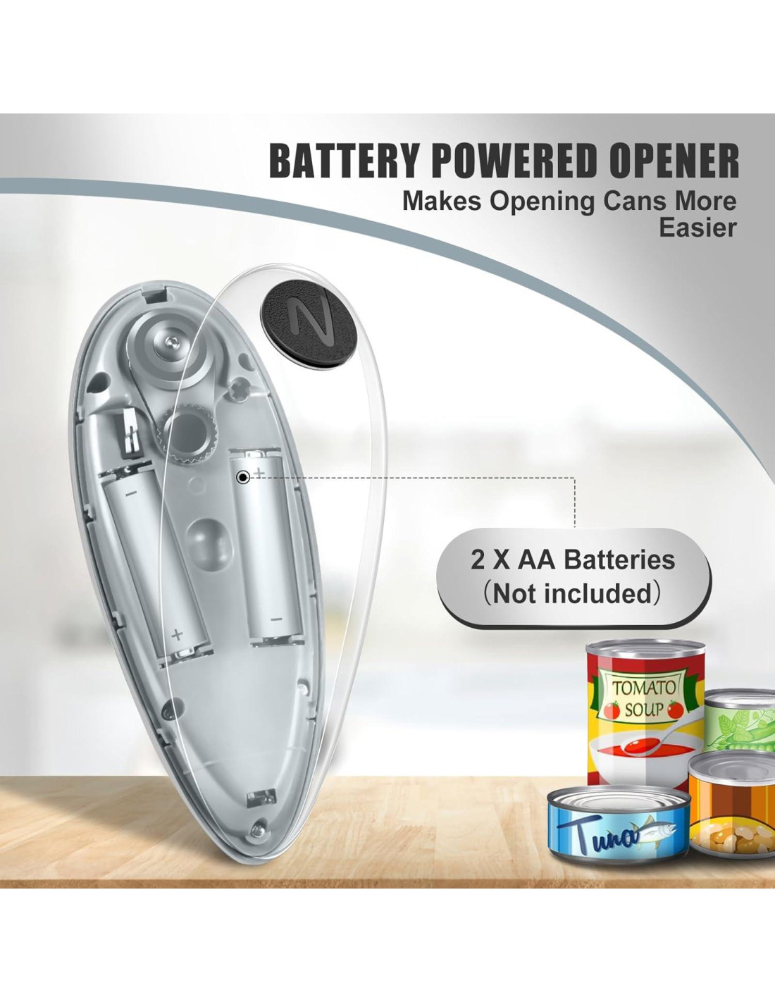- ALIMENTADO POR BATERÍAS Y SILENCIOSO: Este abrelatas portátil es alimentado por 4 baterías AA (no incluidas) y opera en silencio. El compartimento de la batería frontal cuenta con una correa de extracción única para un fácil reemplazo de la batería, proporcionando comodidad que no se encuentra en otros modelos