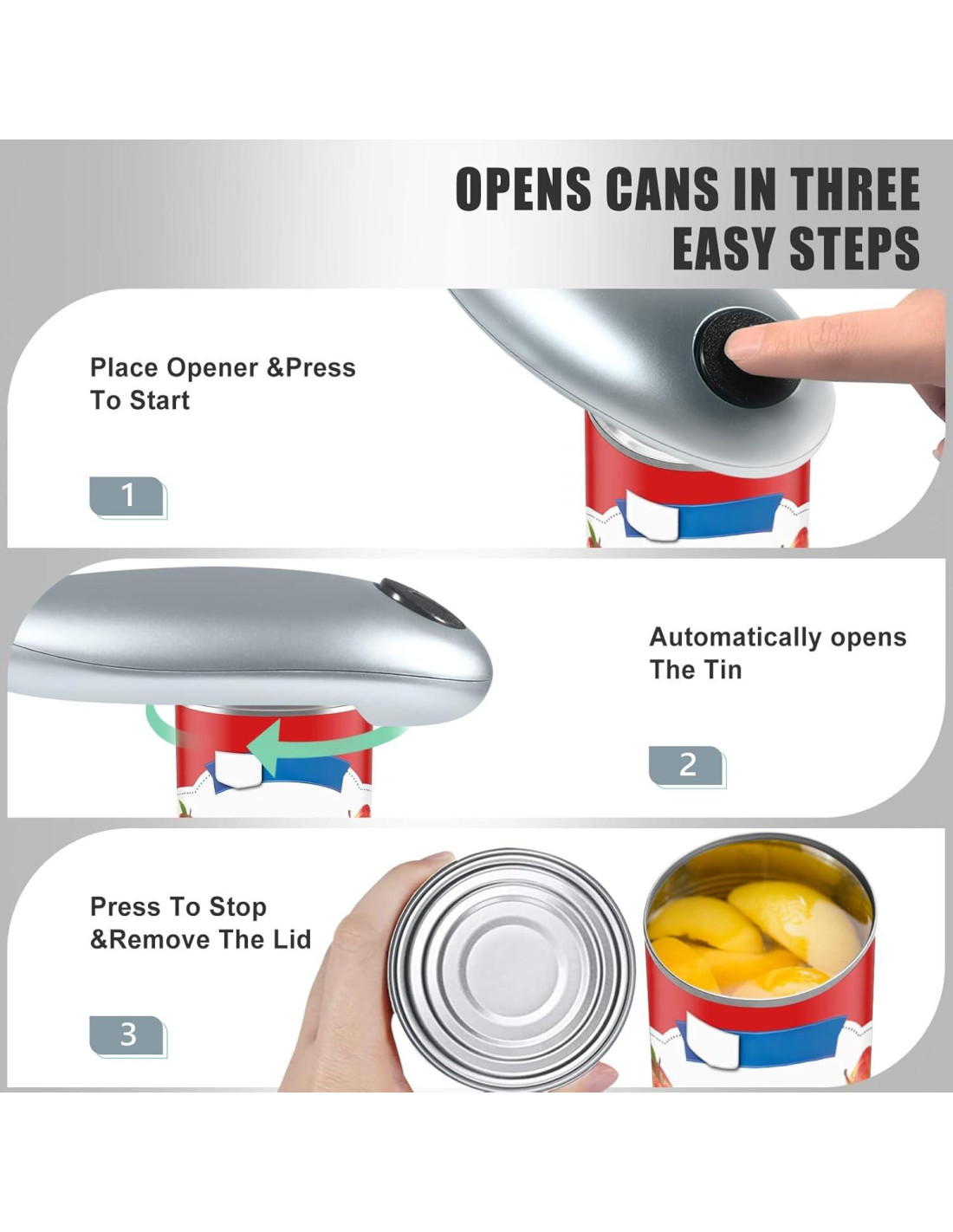 - APERTURA DE LATA SIN ESFUERZO: Con una simple operación de un botón, este abrelatas puede girar 360 alrededor de la lata, y puede ser utilizado sin manos. Puedes detener la operación en cualquier momento. Solo toma 20-25 segundos abrir la lata, lo que es rápido y eficiente de usar