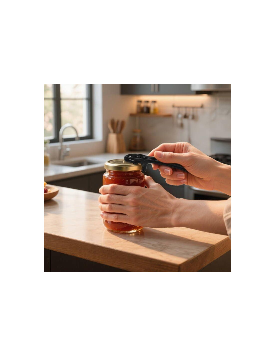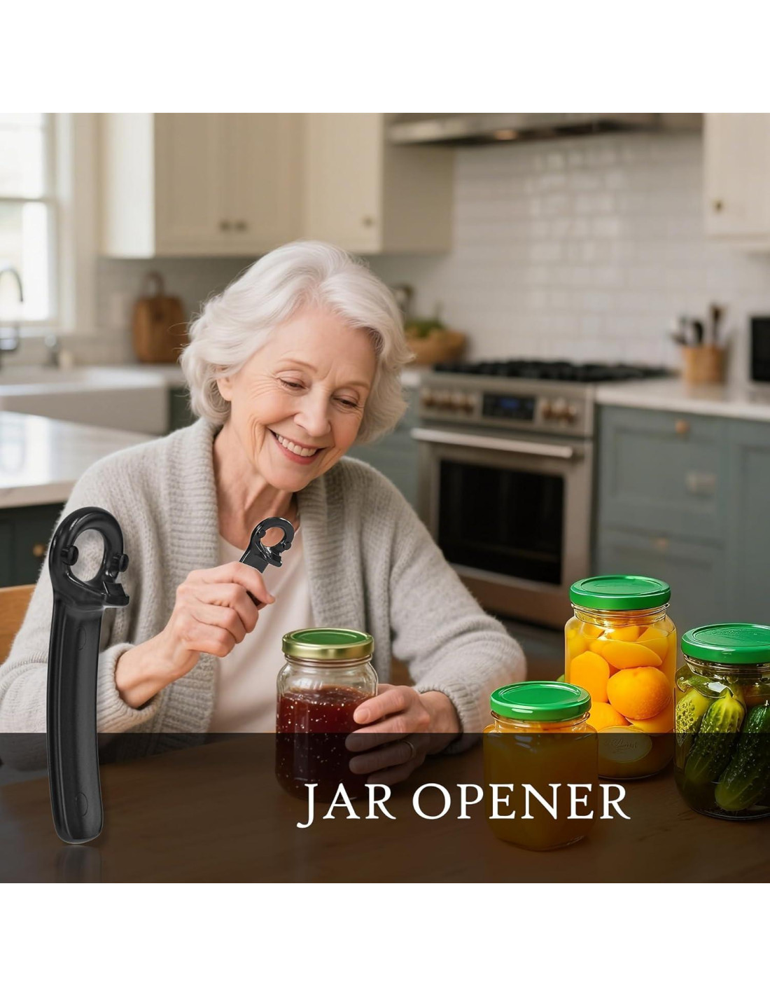 - Abre tapas selladas: El agarre abre la tapa del frasco o la tapa de la botella sin esfuerzo (tamaños máximos 13.5 cm). El mango largo proporciona palanca adicional para tapas rebeldes, incluyendo sellos al vacío (el abridor es ideal para aquellos con fuerza/movilidad limitada en sus manos y/o muñecas).