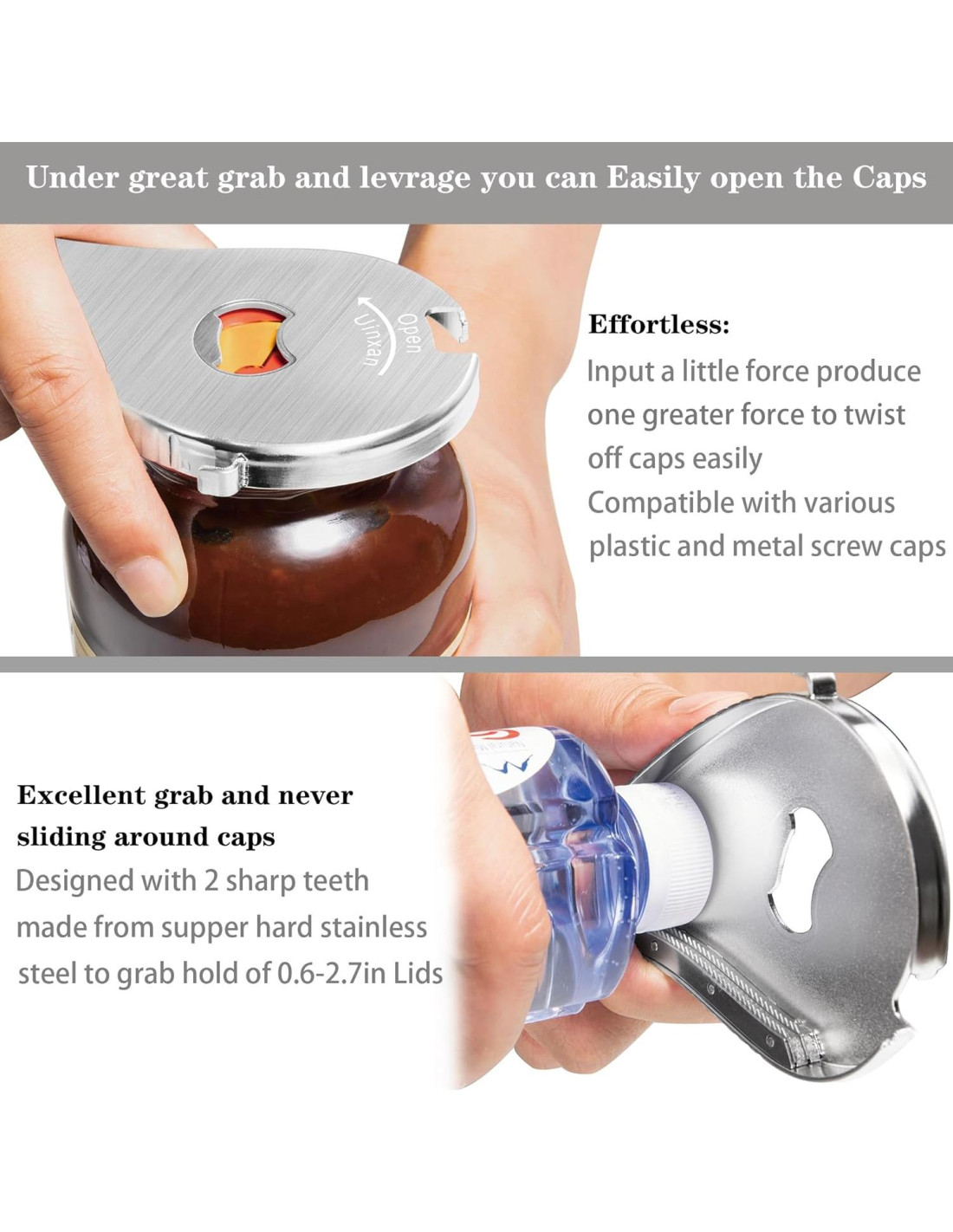 - Apertura de frascos sin esfuerzo y segura: Sin bordes afilados que lastimen tus manos. Los dientes de agarre superior sostienen las tapas (0.6"-2.7" / 15-68mm) sin resbalar. El diseño de palanca requiere un mínimo de fuerza. Compacto y elegante para un fácil almacenamiento. Fabricado con acero inoxidable 304 premium - diseñado para una vida útil.