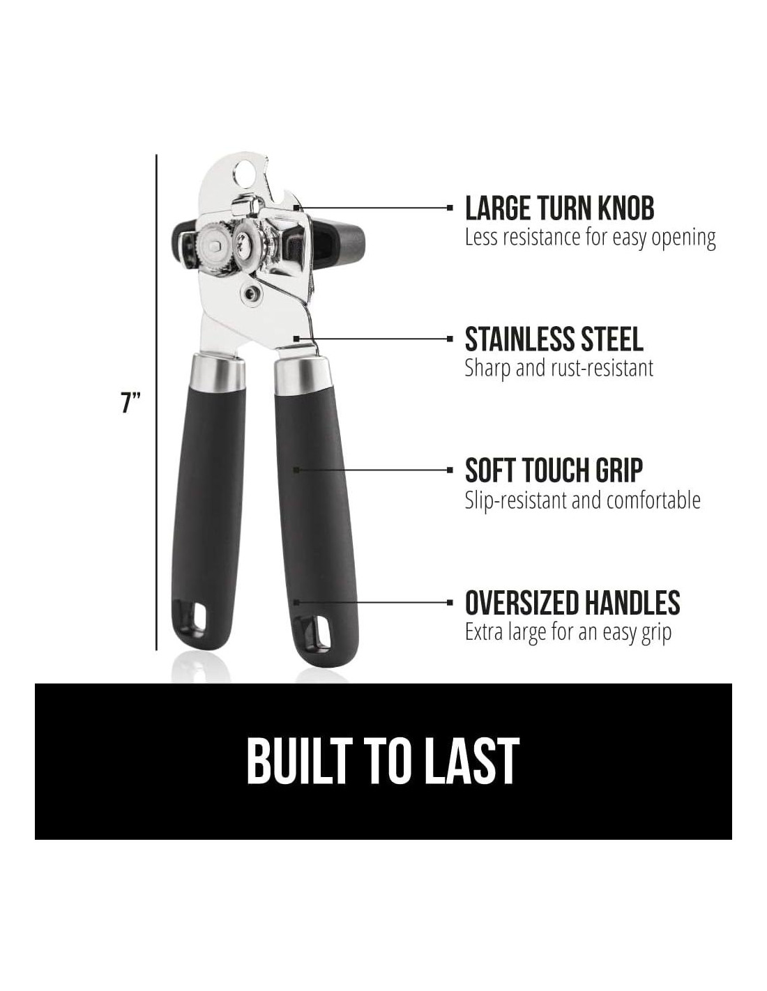 - CONSTRUCCIÓN DE ALTA RESISTENCIA PARA UNA APERTURA MÁS FÁCIL: la apertura de latas sin esfuerzo está aquí; el abrelatas cuenta con un botón de giro extra grande que te permite abrir la lata fácilmente con poco esfuerzo, así que trabajas con el movimiento en lugar de contra él; también incluye construcción de acero inoxidable para un corte sin costuras y mangos sobredimensionados que facilitan un mejor agarre