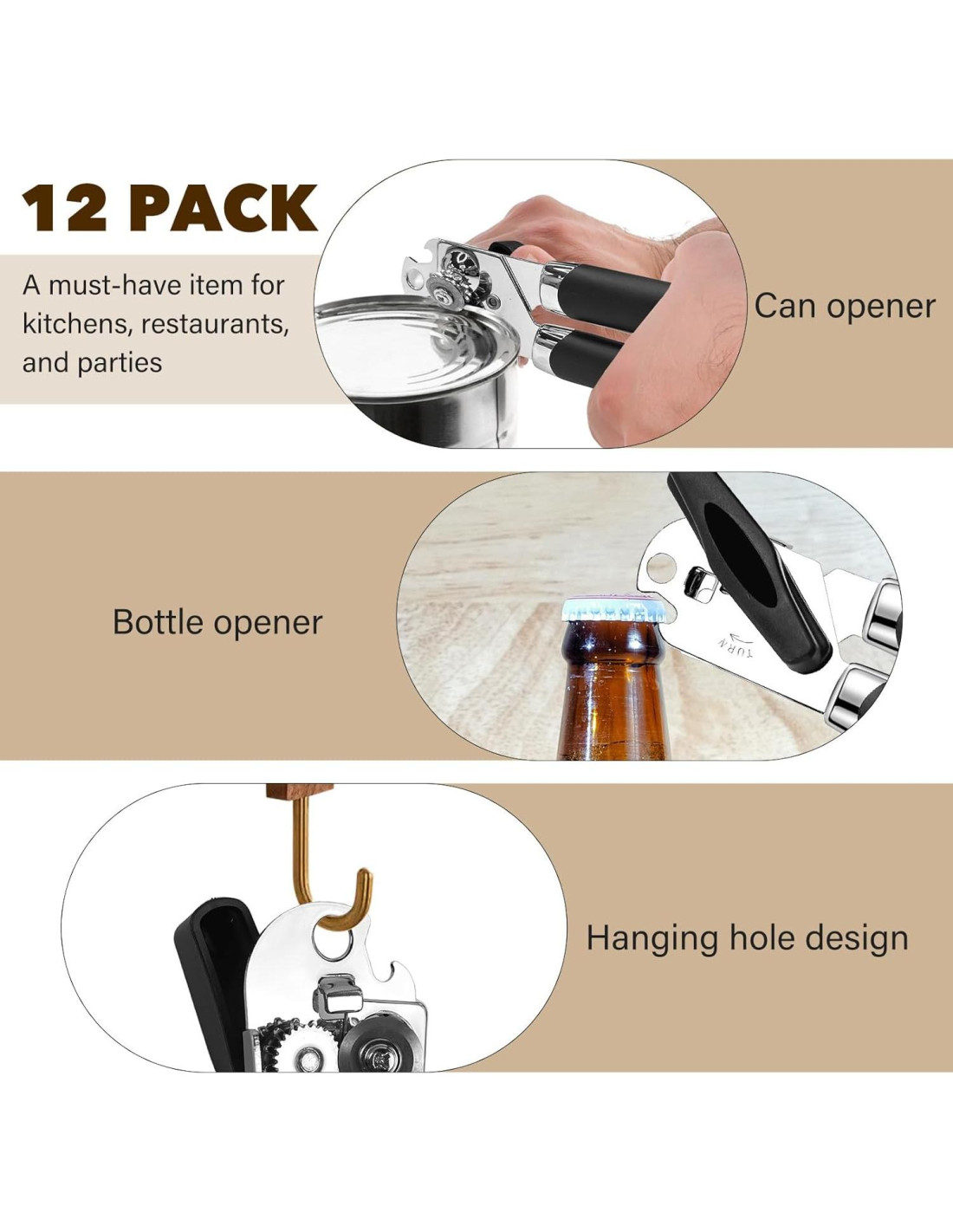 - Fácil de Usar: Diseñado con un mango cómodo y una gran perilla, nuestro abrelatas asegura un agarre seguro para una operación fácil. El diseño del mango oscilante es fácil de usar y adecuado para todos, incluyendo mujeres, adultos mayores o aquellos con artritis, haciendo que abrir varios tamaños de latas sea un esfuerzo mínimo