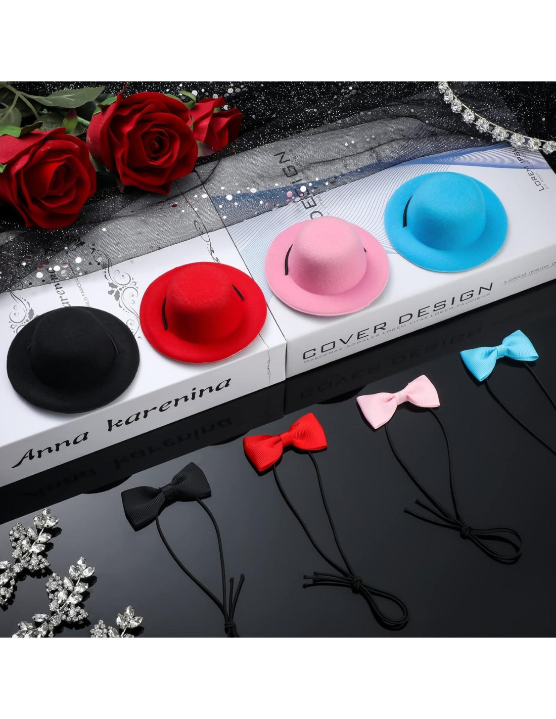 - Suministros de Sombrero y Corbata de Moño para Mascotas Lindas: el paquete incluye 4 conjuntos de sombreros para mascotas de animales pequeños trajes de corbatas de moño, incluyendo 1 sombrero de copa negro, 1 corbata de moño roja, 1 sombrero rojo, 1 corbata de moño negra, 1 sombrero rosa, 1 corbata de moño rosa, 1 sombrero de copa azul, 1 corbata de moño azul, cantidad y color suficientes para satisfacer las necesidades decorativas de tu mascota.