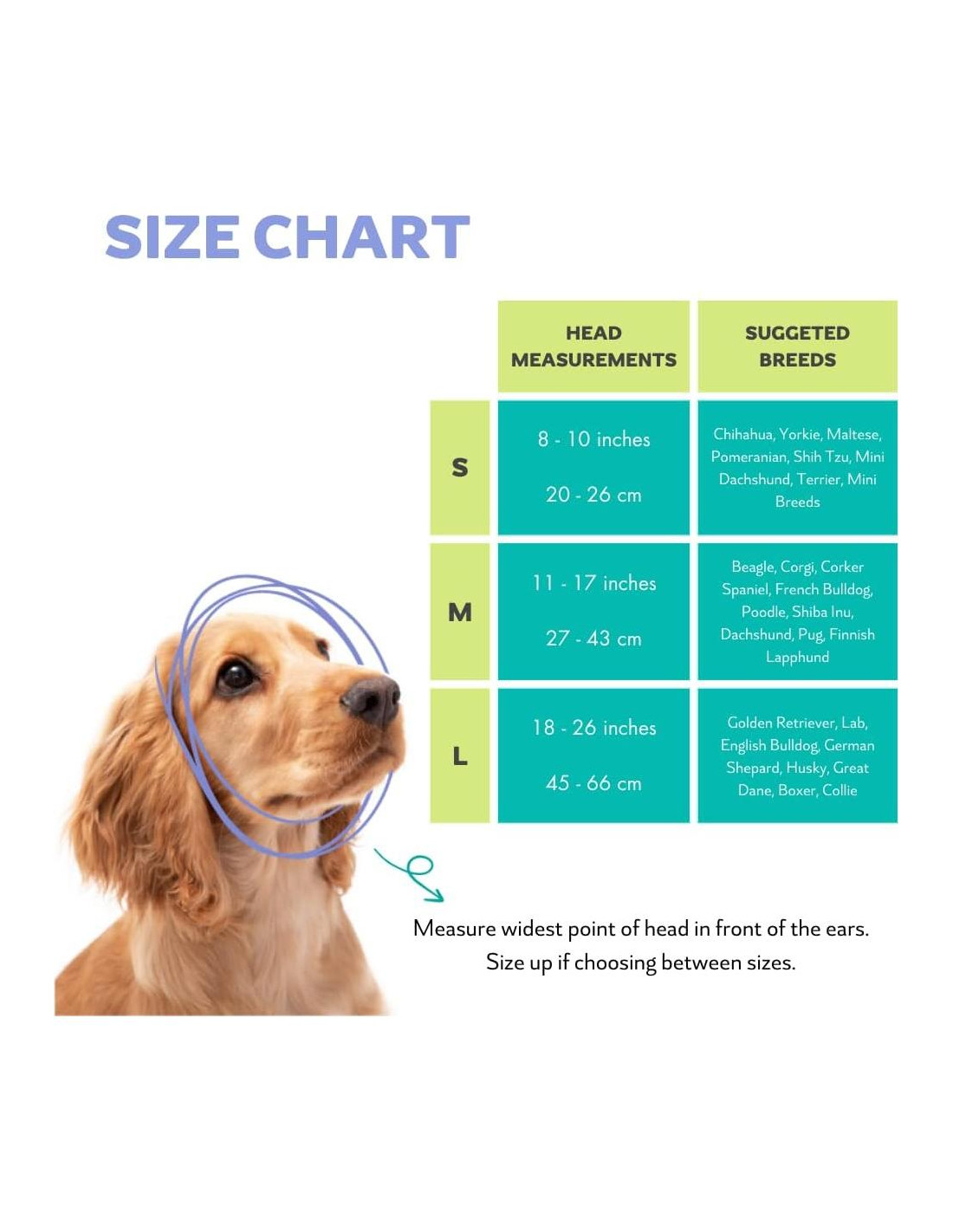 - Asegúrese de revisar nuestra guía de tamaños y medir a su mascota para elegir la opción de tamaño correcta; Cada perro es diferente, y el tamaño de la cabeza puede ser muy diferente para cada perro