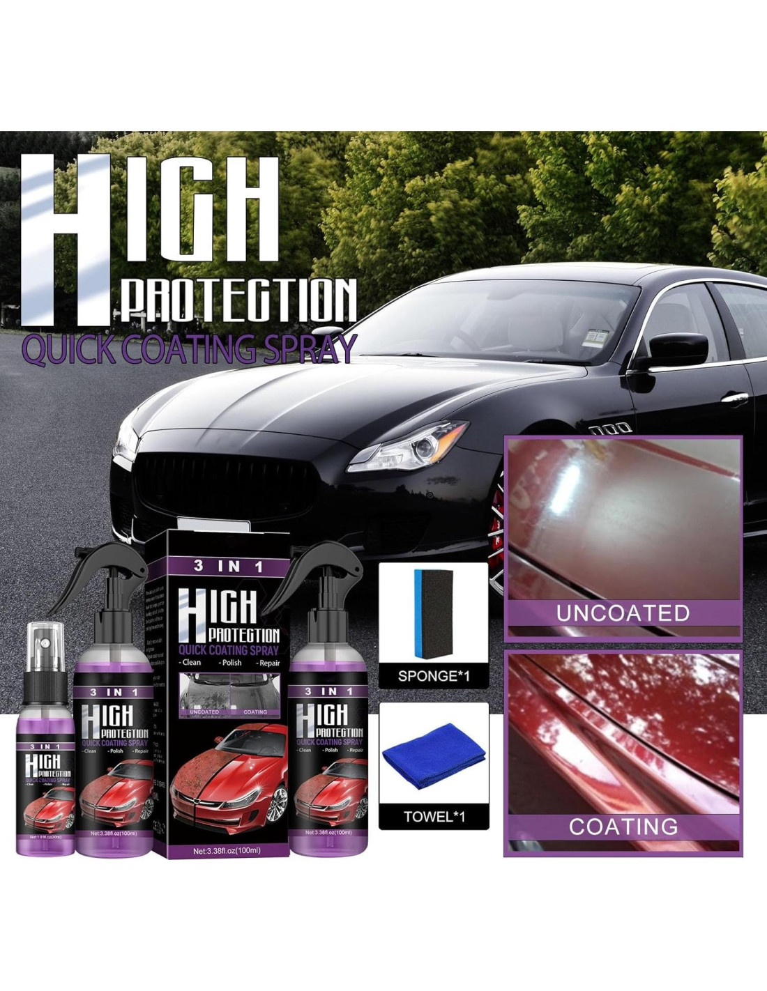 - Spray Rápido de Recubrimiento de Coche de Alta Protección 3 en 1 -- La forma más fácil, rápida y eficiente de limpiar, restaurar y pulir coches con nuestro Spray de Recubrimiento Rápido de Alta Protección 3 en 1. Te proporciona un lavado sin agua, crea una apariencia limpia