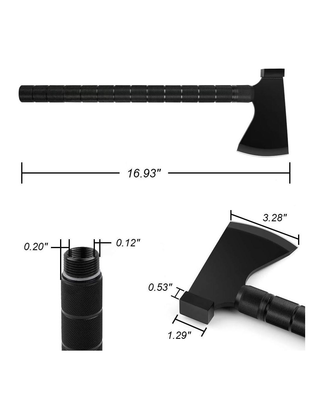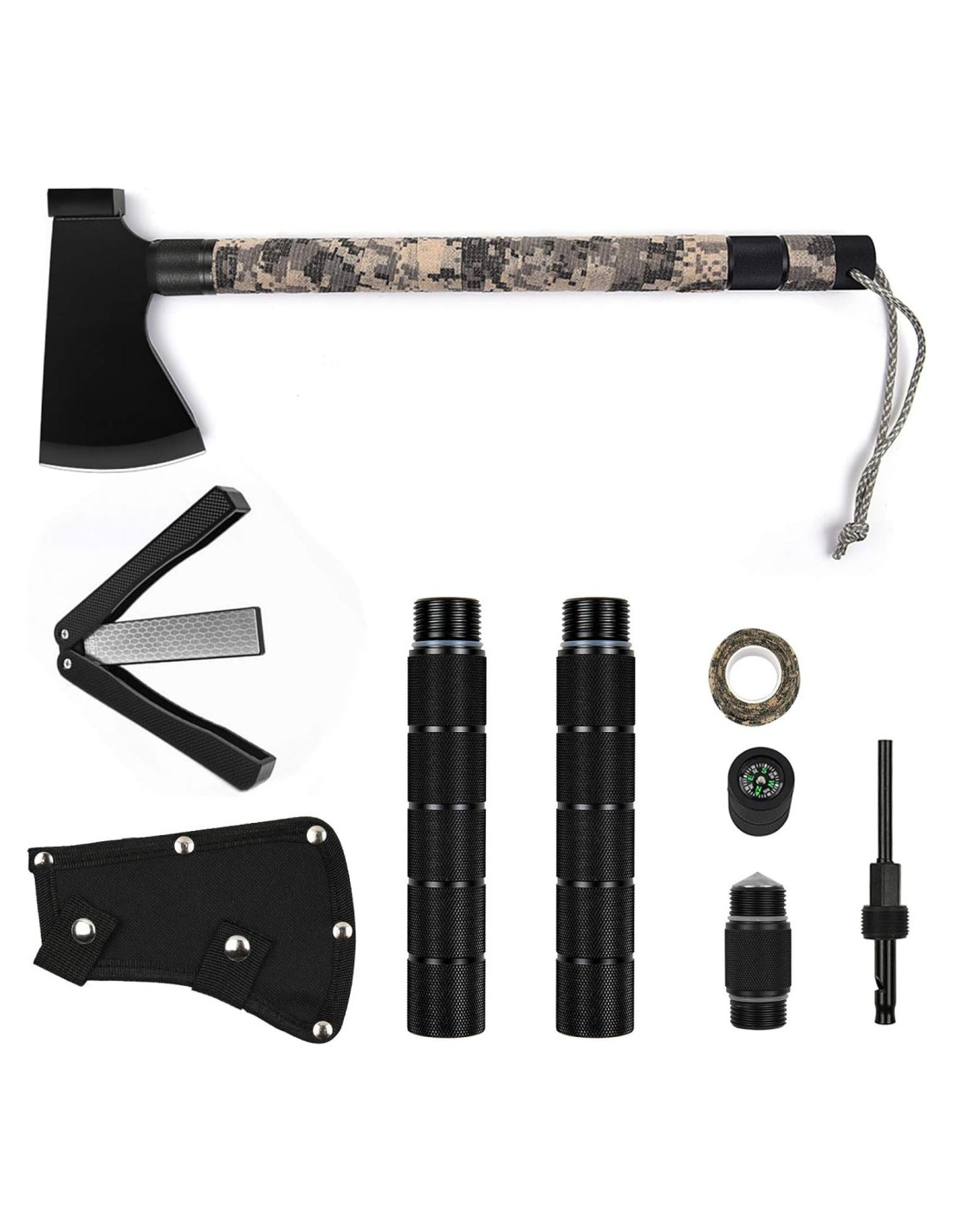 - Hacha de Supervivencia con Diseño Modular - El diseño permite que el hacha cambie de un hacha ligera y de mango corto a un hacha de mango más largo fácilmente para trabajos más grandes. Cada tubo individual ofrece espacio de almacenamiento para llevar muchos artículos extra como yesca, dinero, paracord, etc. Este hacha tiene las herramientas más necesarias para aquellos que se aventuran profundamente en la gran naturaleza.