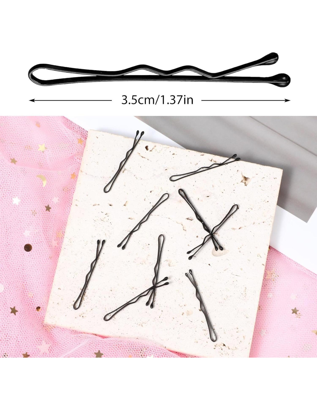 Lista de Empaque: 150pcs x pasadores de pelo Especificación: Material: hierro Color: negro, marrón, dorado Dimensiones del producto: 3.5 x 0.5 x 0.15 cm (1.37 x 0.19 x 0.047 in) Característica: 1. Antioxidante, no se decolora, duradero y no se deforma fácilmente. 2. El diseño de cabeza de bola no lastima el cuero cabelludo y es más cómodo de usar. 3. Diseño en forma de onda, líneas hermosas, ajustado y no se caerá. 4. Caja de plástico PP importada, duradera y reutilizable.