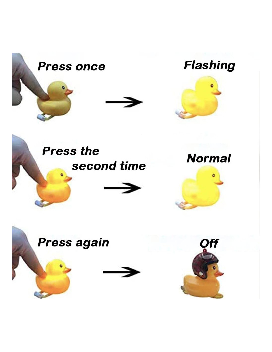 - Rey de la Función: Tiene 12 lúmenes de luz amarilla y 45 decibelios de sonido, emitiendo un sonido al apretar o presionar el pato. Hay dos modos de luz: siempre encendido/parpadeando. Puedes disfrutar del ciclismo en la oscuridad.