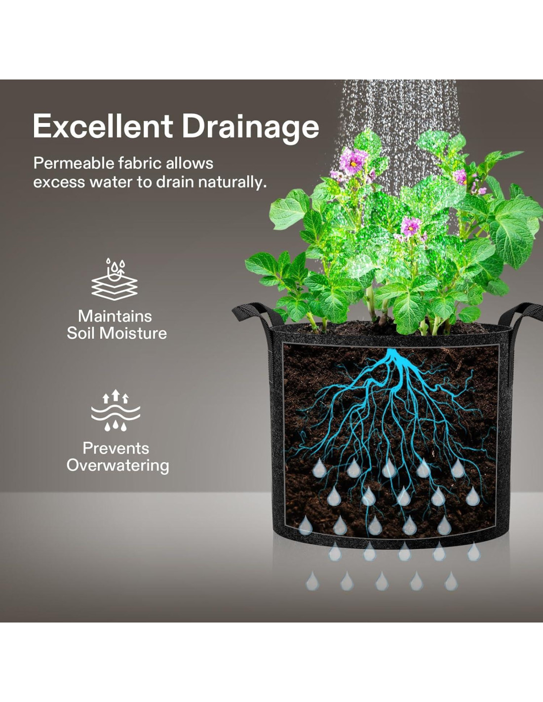 - Gran Drenaje: La tela no tejida significa que las macetas no retienen agua en exceso, permitiendo que tus raíces respiren para un crecimiento más saludable y vigoroso