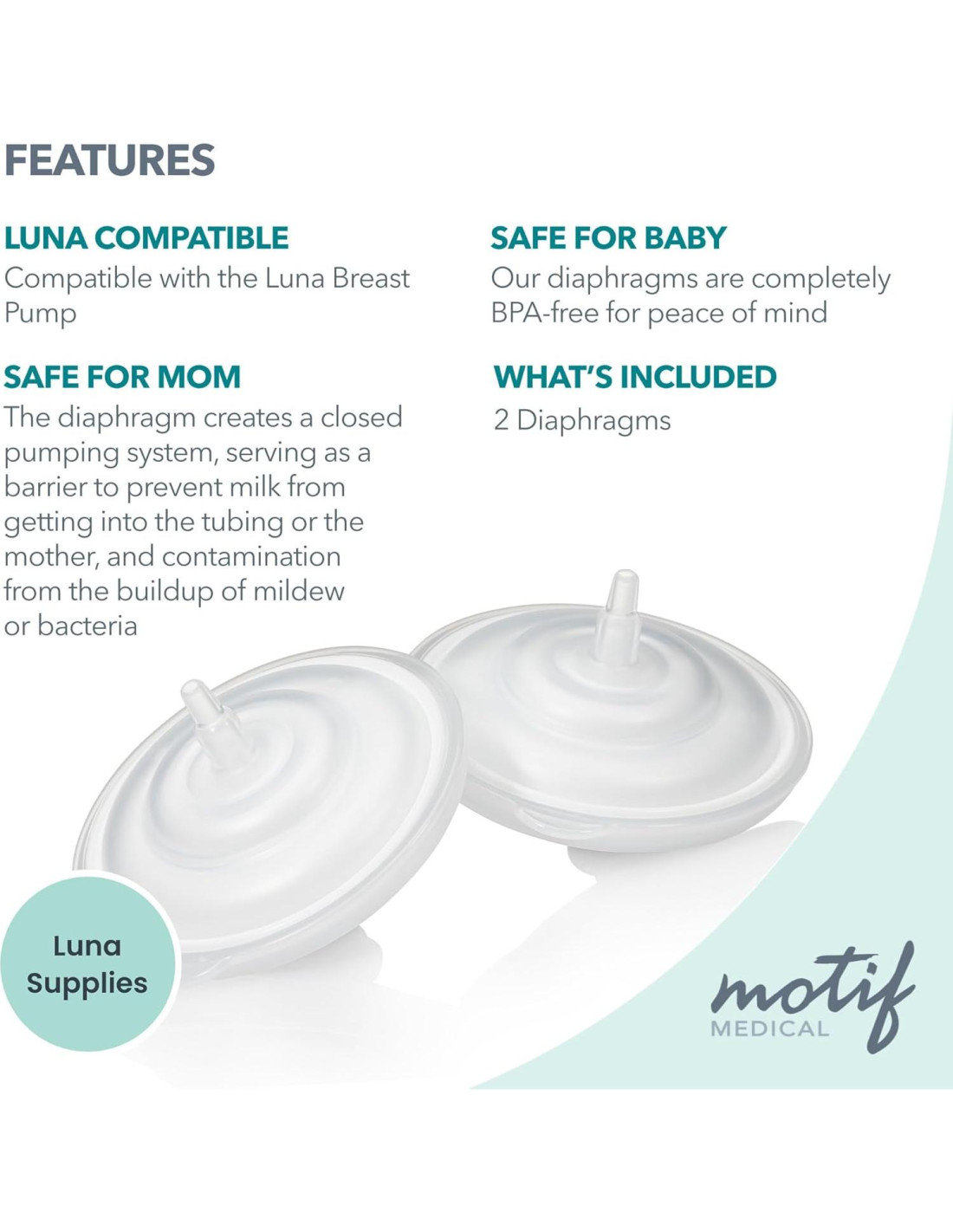 - COMPATIBLE: Estos diafragmas funcionan con el extractor de leche luna y vienen en un juego de 2. Son los ensamblajes redondos de plástico que se conectan a la parte superior del escudo de lactancia para permitir la extracción en un sistema cerrado.