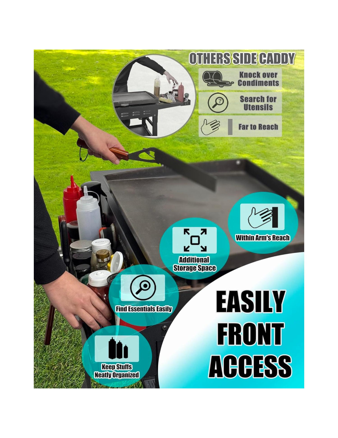 - AMPLIA COMPATIBILIDAD: Este caddy de herramientas es adecuado para la mayoría de las planchas blackstone de 28 pulgadas, incluyendo las planchas 28XL, su recubrimiento negro también combina perfectamente con tu parrilla blackstone. (NOTA: NO compatible con las planchas con gabinetes y freidoras de aire)