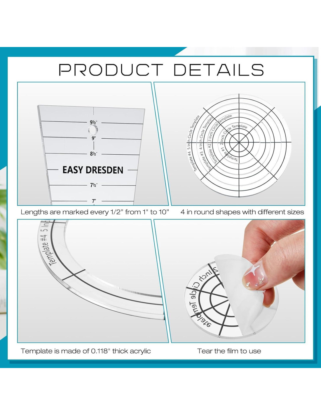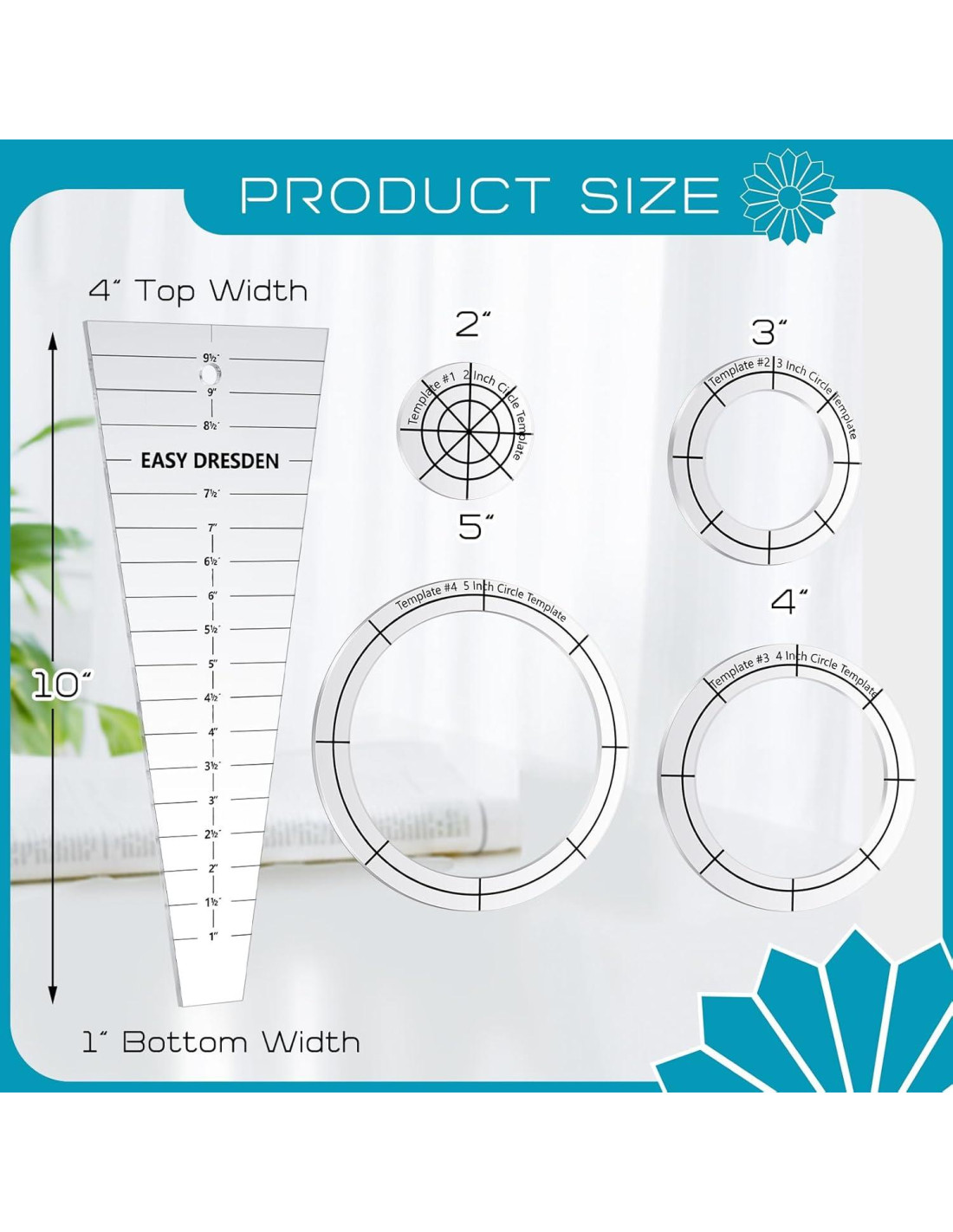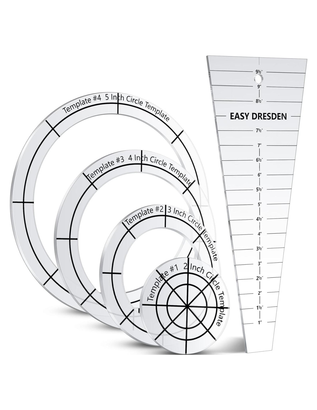 - Ideal para Patchwork: la plantilla de plato dresden para patchwork está diseñada para hacer hermosos patrones para tu trabajo de patchwork, la forma trapezoidal es de aproximadamente 10 pulgadas (25.4 cm) de largo, la forma redonda es de aproximadamente 2 pulgadas (5.08 cm), 3 pulgadas (7.62 cm), 4 pulgadas (10.16 cm) y 5 pulgadas (12.7 cm) de diámetro, mejorando tu eficiencia en patchwork, ahorrando tiempo y esfuerzo