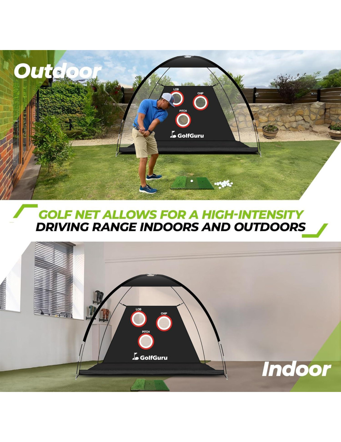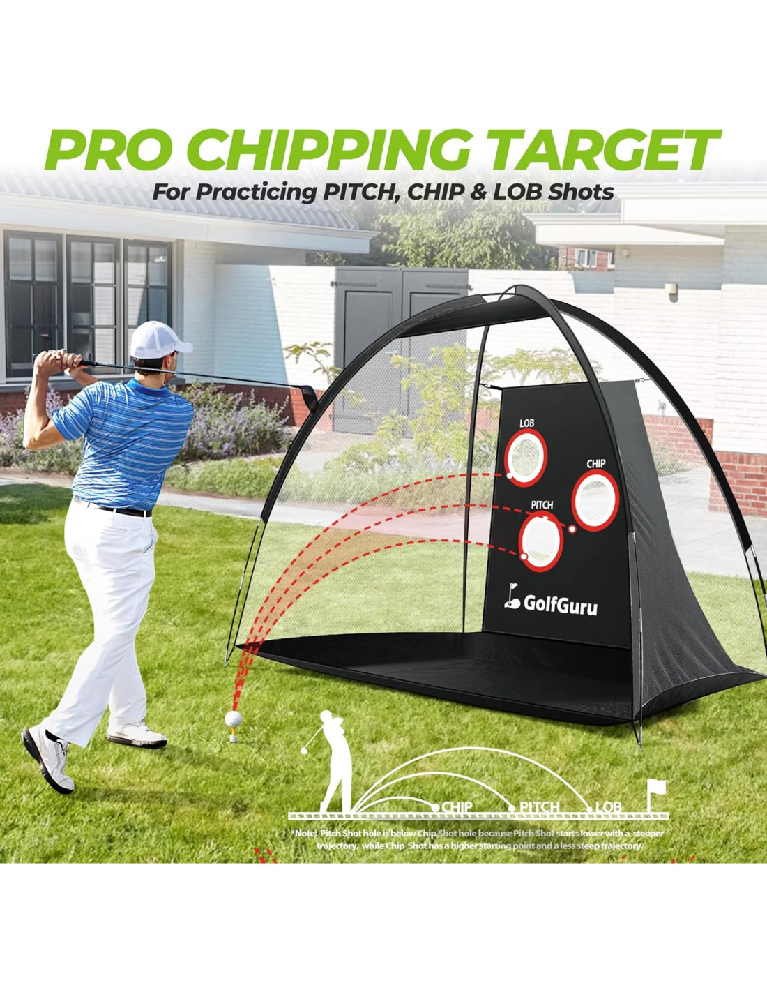 - Red de Golf con Objetivo de Chipping Profesional - Mejora tus habilidades de golf en casa con este equipo de entrenamiento de golf todo en uno. Incluye una red de 10x7 pies (3,05x2,13 m), una alfombrilla tri-turf, 1 objetivo de chipping profesional, 10 pelotas, 7 tees y 2 tees de goma. Nuestro exclusivo objetivo de chipping profesional te permitirá practicar diferentes técnicas de chipping como chip, pitch y lob. Mejora tus habilidades de conducción y chipping y sorprende a tus amigos con esta red de golf para interiores. Un gran regalo de golf para hombres.