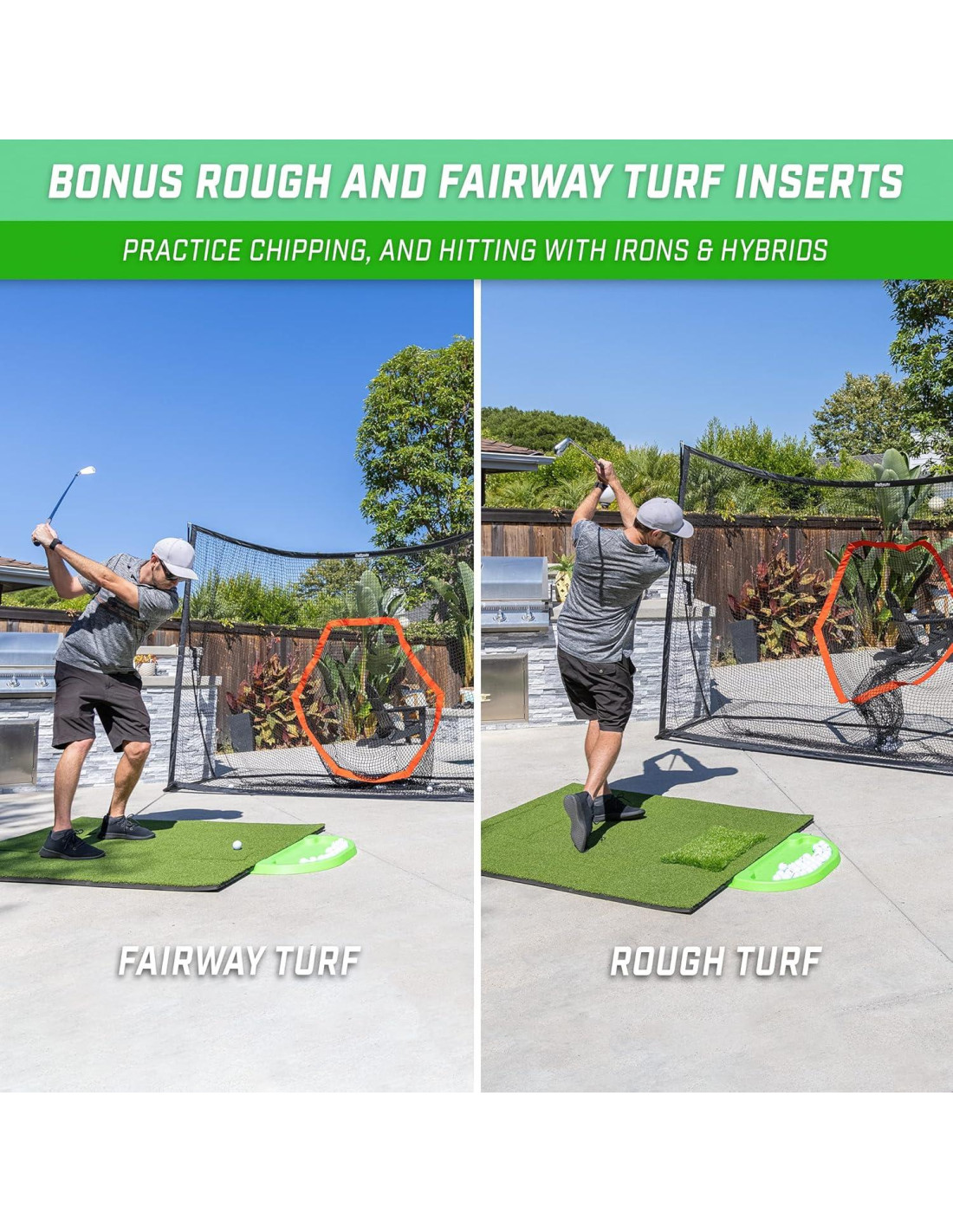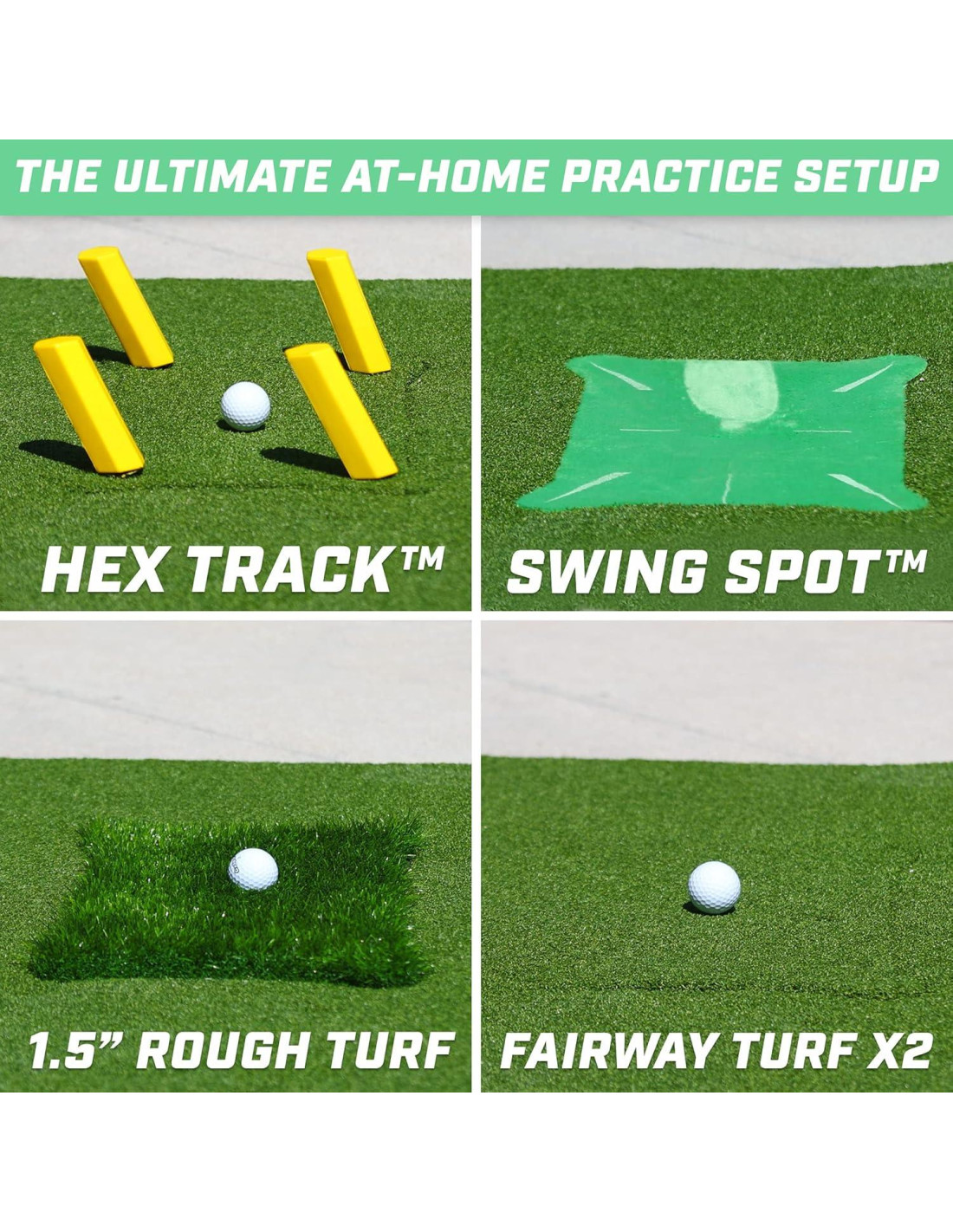 - CÉSPED DE FAIRWAY Y ROUGH: Incluye 2 céspedes de fairway para práctica de swing tradicional con 3 tees de goma; También incluye césped de rough de 1.5 pulgadas (3,81 cm) para práctica realista en hierba más larga