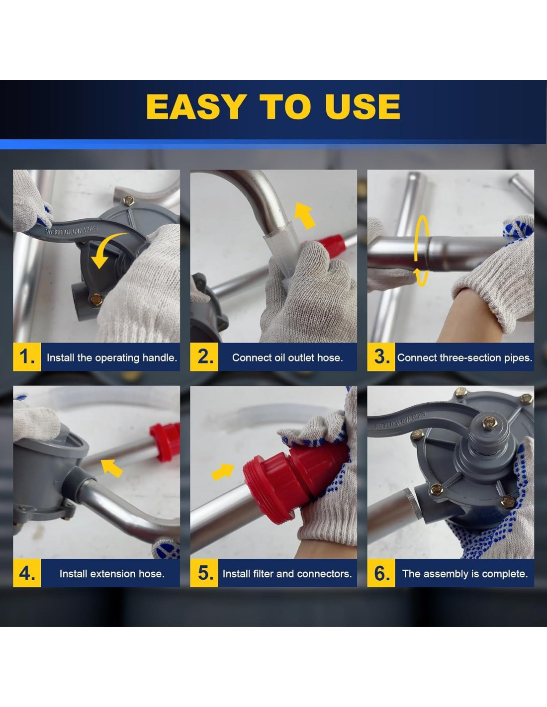 se especializa en proporcionar productos de cuidado automotriz de alta calidad que varían desde herramientas y accesorios especializados hasta mantenimiento y cuidado general, cubriendo la mayoría de las marcas y modelos. es proporcionar un servicio de producto de calidad a todos los clientes que compran nuestros productos. Ya sea que seas un mecánico profesional o aficionado, puedes comprar lo que deseas en nuestra tienda. estamos comprometidos a dar más valor a cada elección que hagas. Esta bomba de aceite de manivela es perfecta para extraer rápidamente y fácilmente aceite de barriles, tambores y tanques pequeños. Maneja varios aceites, incluyendo aceite de calefacción de suelo, gasolina, diésel, aceite lubricante y aceite de cocina, lo que la convierte en una herramienta versátil para múltiples aplicaciones. Esta bomba de barril de aceite de manivela rotativa está diseñada para una transferencia de líquido rápida y sin esfuerzo. Equipado con un tubo de succión segmentado de tres piezas, esta bomba de transferencia de combustible desmontable permite un fácil ajuste de la longitud del tubo para adaptarse a tus necesidades específicas. La bomba de barril de aceite es increíblemente fácil de ensamblar y desensamblar, no requiere herramientas ni perforaciones. Simplemente atornilla las tuberías juntas para una configuración rápida y fácil. Su tamaño compacto y diseño liviano la hacen fácil de almacenar y transportar. La herramienta de bomba de aceite de tambor manual puede lograr una tasa de flujo de 70 RPM y levantar líquidos hasta 5 metros, ahorrándote tiempo y energía en comparación con métodos tradicionales. Esta bomba de transferencia de aceite de mano está fabricada de aleación de aluminio, ofreciendo alta resistencia, excelente resistencia al desgaste y construcción liviana. La herramienta extractora de bomba de aceite resiste la corrosión y está diseñada para un uso duradero. La bomba de tambor de aceite es adecuada para transferir aceites de motor, aceite de máquina, líquido de transmisión, aceites de calefacción, etc. Puedes disfrutar de un bombeo fácil y eficiente con nuestro diseño ergonómico de manivela.