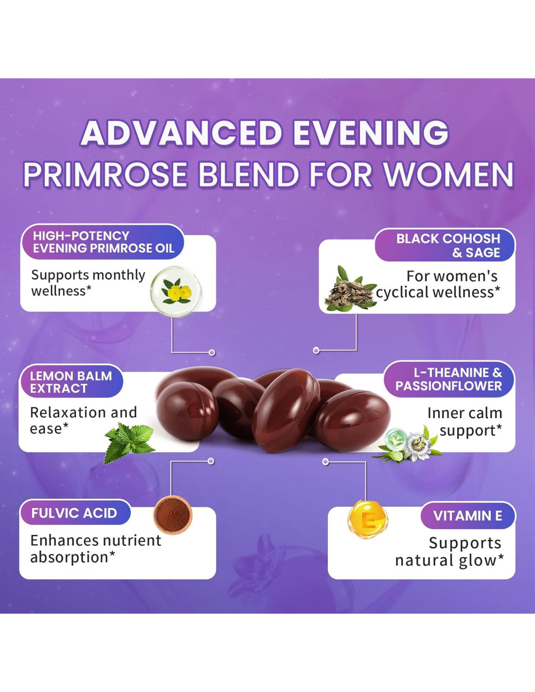 - Softgels de Bienestar Nocturno y Apoyo al Estado de Ánimo: Diseñados especialmente para las necesidades nocturnas de las mujeres, este complejo calmante presenta L-Teanina, Melisa y Flor de Pasión para ayudar a promover la relajación, el equilibrio del estado de ánimo y un sueño reparador, haciendo que sea más que su aceite de onagra estándar para mujeres.