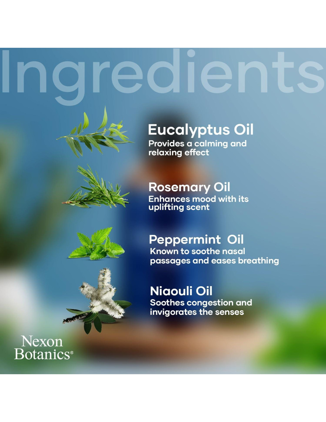 - La Mezcla de Aceite Esencial Breathe de Nexon Botanics consiste en una combinación propietaria de aceites de Eucalipto, Romero, Menta y Niaouli; Todos los aceites son libres de hexano y de grado terapéutico.