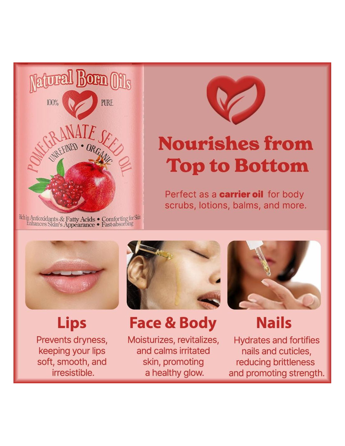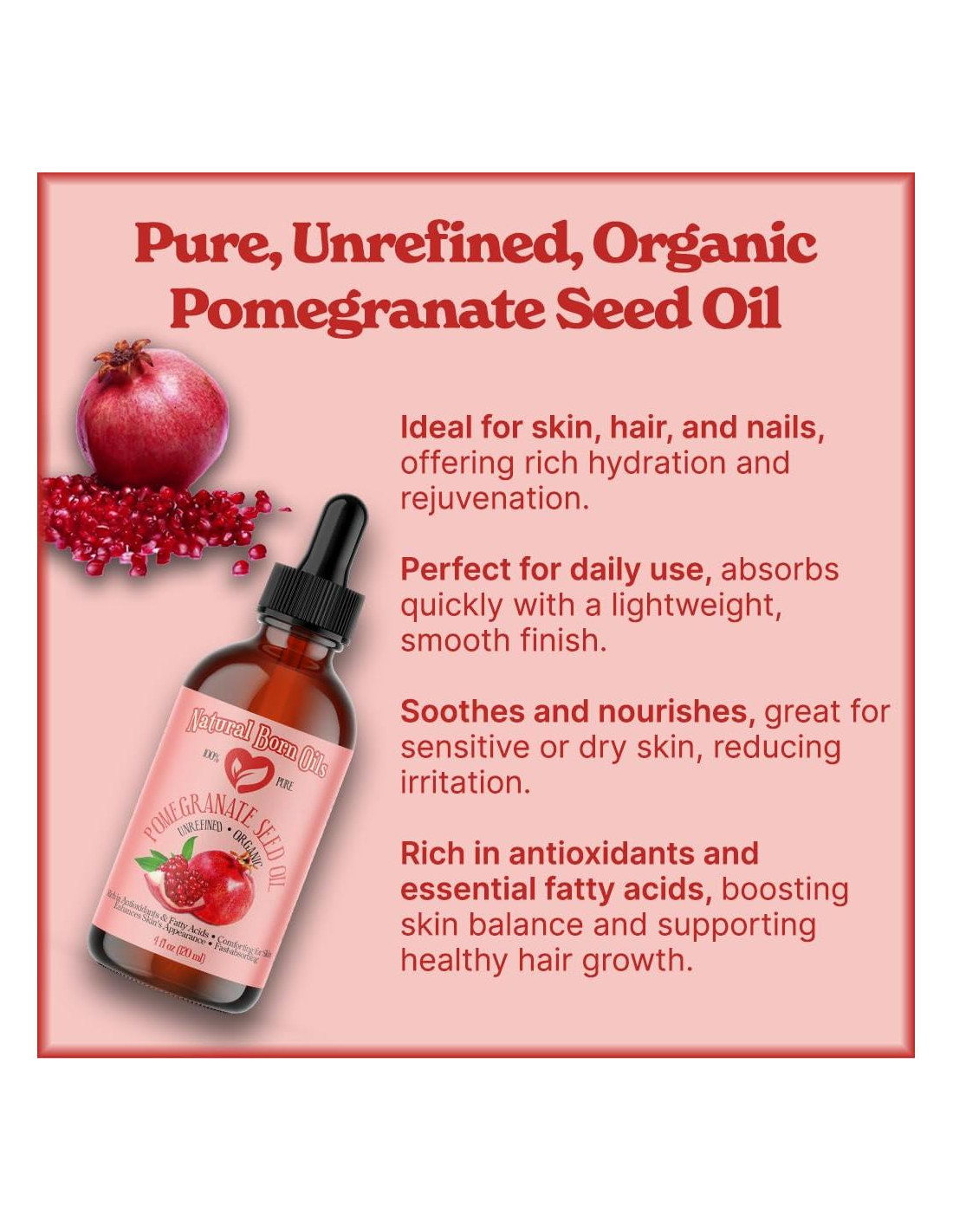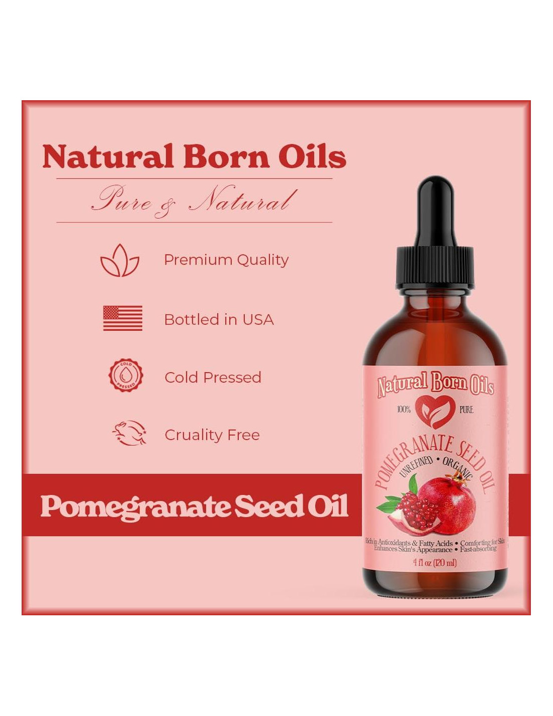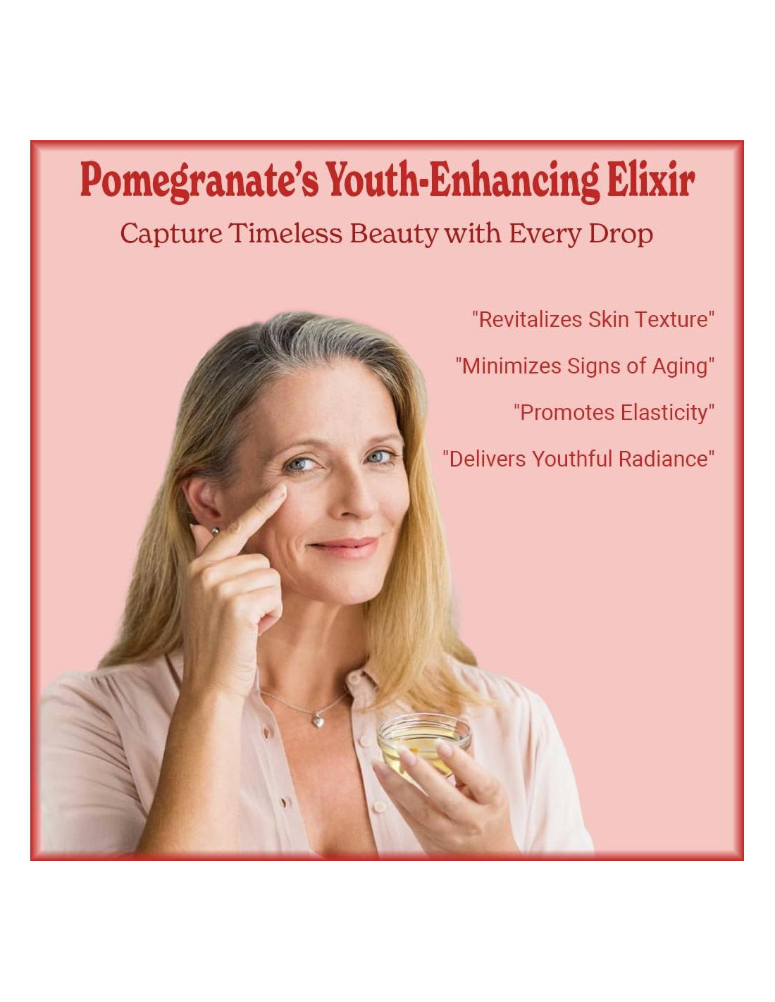 - RICO EN ANTIOXIDANTES: El Aceite de Semilla de Granada, repleto de antioxidantes y ácido punícico, apoya la rejuvenecimiento de la piel y la salud del cabello.
