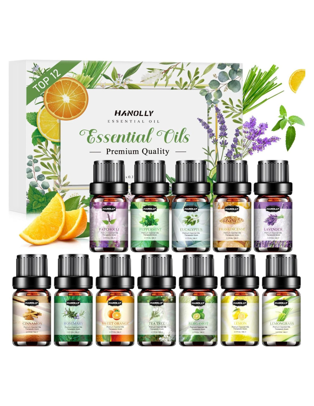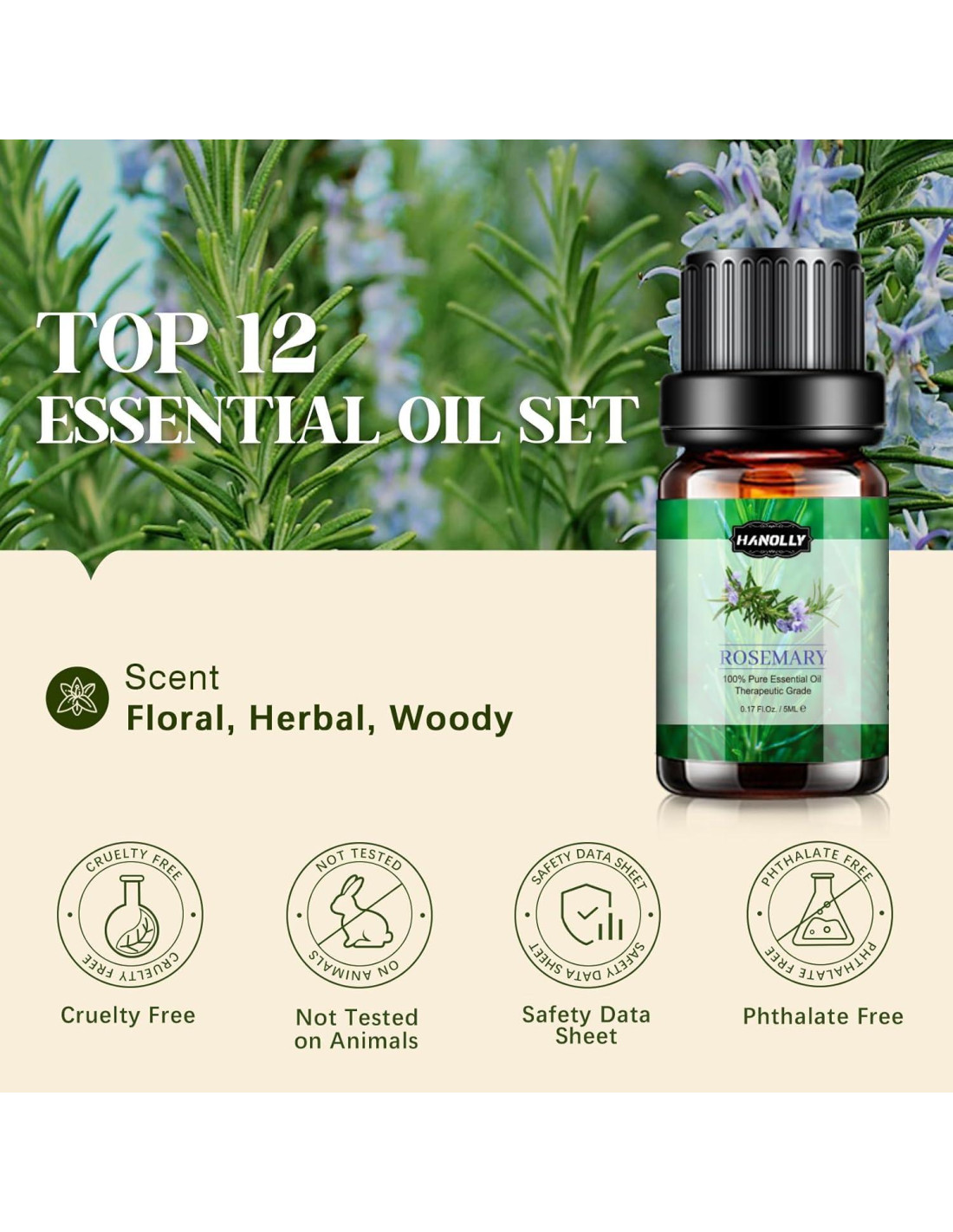 - 12 x 5mL Juego de Aceites Esenciales: Este set de regalo incluye algunos de los aceites esenciales más populares y demandados - Árbol de Té, Lavanda, Naranja Dulce, Eucalipto, Hierba de Limón, Menta, Limón, Bergamota, Incienso, Romero, Pachulí, Aceite de Canela.