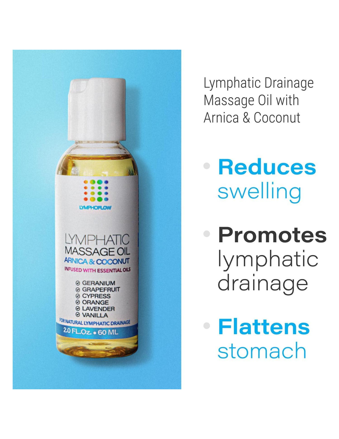 - CÓMO FUNCIONA: Este aceite está diseñado para mejorar aún más el drenaje linfático natural durante y después de la sesión de masaje linfático manual. El aceite de coco orgánico penetra profundamente en la piel y los tejidos blandos, entregando aceites esenciales linfogenicos y Árnica Montana para promover la circulación linfática, disminuir moretones, hinchazón e irritación de los sitios postquirúrgicos, resultando en una recuperación más rápida. Además, el aceite promueve la desintoxicación natural del cuerpo, la salud del sistema linfático e inmune.