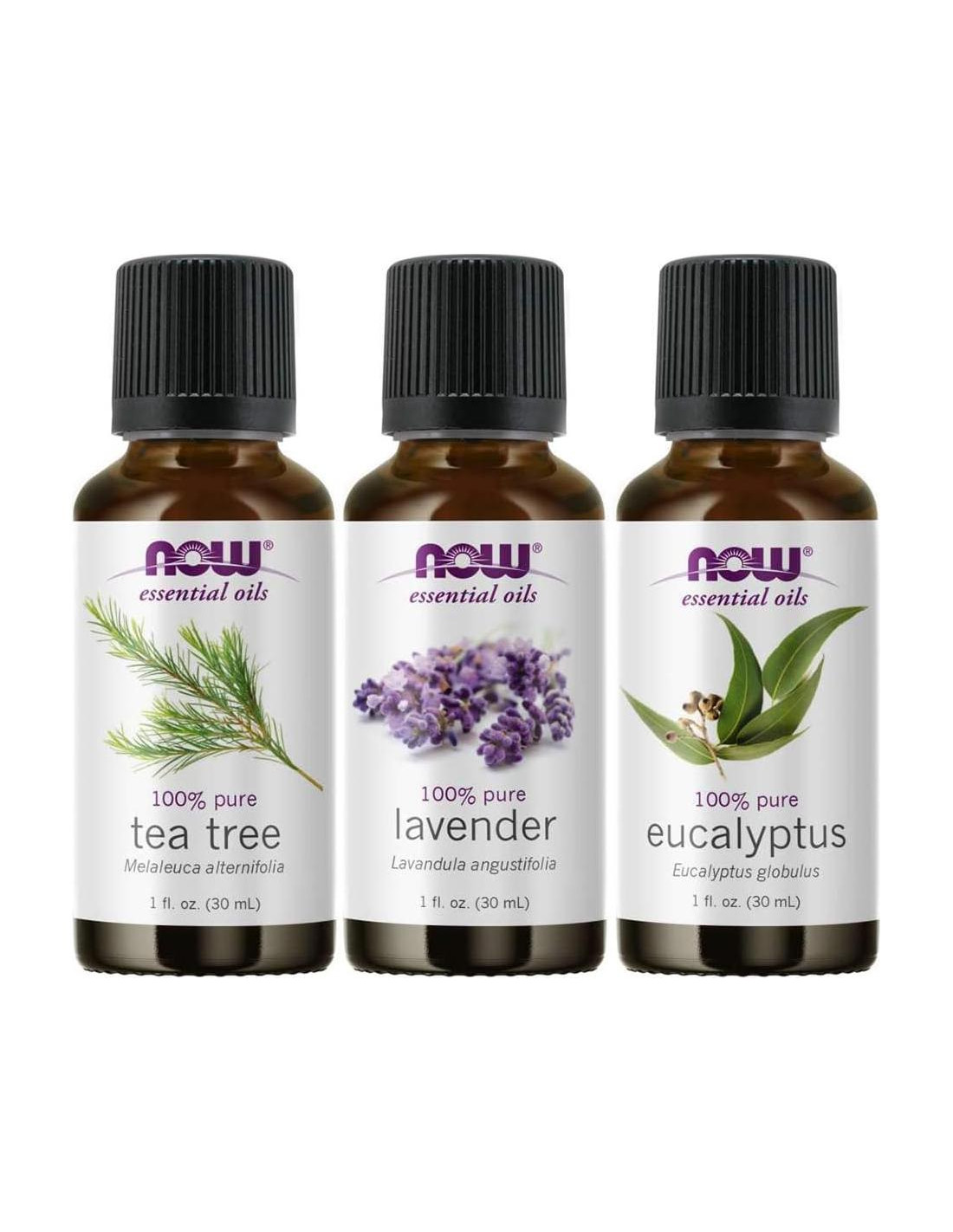 Paquete de 3 de Aceites Esenciales NOW Eucalipto, lavanda y aceite esencial de árbol de té 100% puro El aceite de eucalipto puede ayudar a tratar afecciones como fiebre o tos El aceite de lavanda tiene propiedades calmantes y puede ayudar a reducir la irritación de la piel El aceite de árbol de té contiene fuertes propiedades antisépticas y germicidas Altamente concentrado; manejar con cuidado. No tomar por vía oral. Botellas de 29.57 ml.