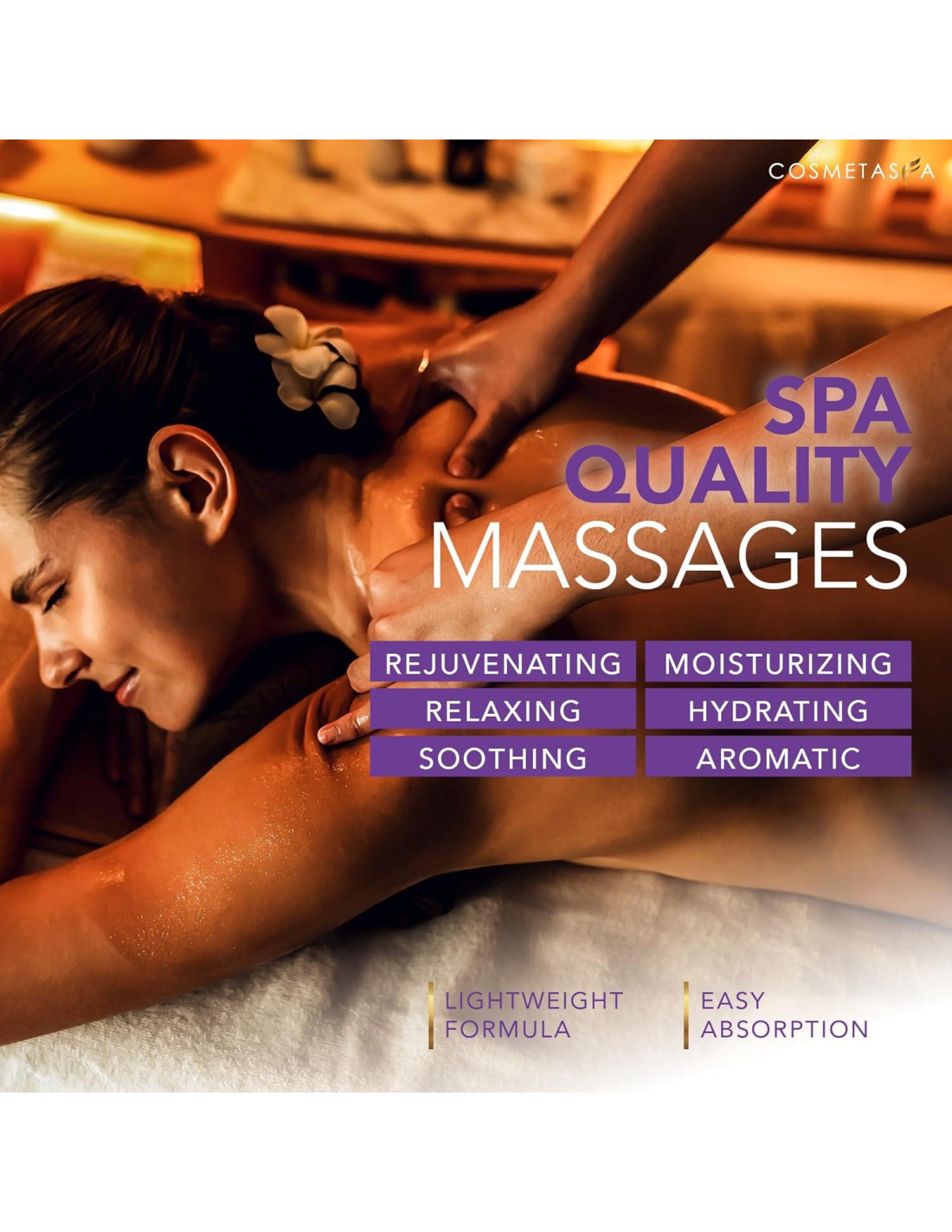 - ACEITE DE MASAJE DE CALIDAD DE SPA CALMANTE, SUAVE Y AROMÁTICO HECHO EN EE. UU. - El Aceite de Masaje de Relajación Cosmetasa está elaborado con una mezcla única de aceites de calidad para proporcionar el equilibrio perfecto de un masaje suave, ligero y calmante. El aceite de lavanda infunde este aceite de masaje premium con un aroma calmante que mejorará su bienestar.