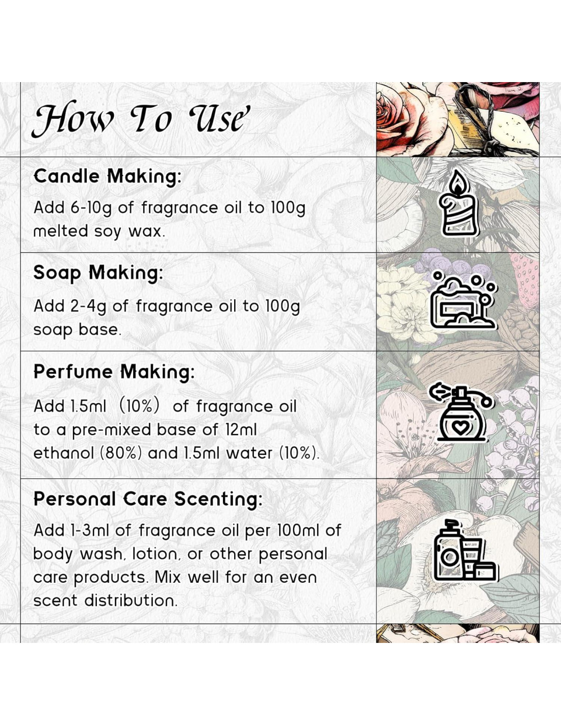 - Fragancia de larga duración: Hecho de compuestos aromáticos de alta calidad y amigables con la piel, este aceite de fragancia se mezcla sin esfuerzo en ceras, lociones y bases, ofreciendo un aroma consistente y duradero en cada producto casero