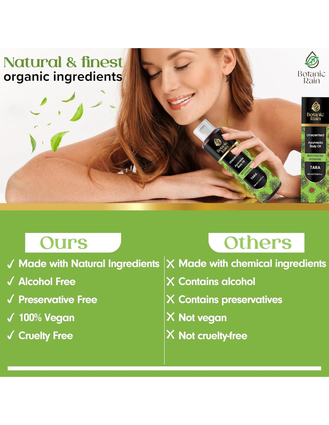 - ARMONÍA AYURVÉDICA: El aceite corporal de hidratación diaria está elaborado con aceites esenciales orgánicos para la piel para equilibrar los tres doshas (Vata, Pitta y Kapha), haciéndolo adecuado para todos los tipos de piel y promoviendo la armonía general de la piel.