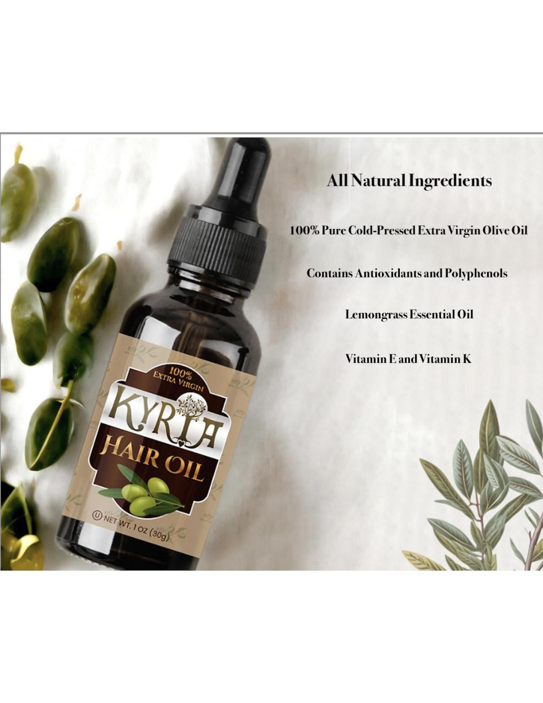 Descubre el secreto para un cabello radiante y saludable con el aceite de oliva 100% prensado en frío de Kyria para el cabello, infusionado con refrescante hierba limón. Proveniente de olivares familiares en Grecia, este lujoso aceite se elabora con el mayor cuidado para ofrecer beneficios excepcionales para tu rutina de cuidado del cabello. Como un suero efectivo contra el frizz, este aceite de oliva es perfecto para domar el cabello rebelde y reducir el frizz. La textura ligera y no grasa asegura que se pueda usar como un spray de aceite de oliva para el cabello o suero para cabello frizz y dañado. Enriquecido con aceite de vitamina E, nuestro aceite de oliva actúa como un poderoso aceite natural para el crecimiento del cabello. Apoya la salud del cuero cabelludo y promueve el crecimiento del cabello, convirtiéndolo en una adición vital a tus productos y rutina de crecimiento del cabello. Usa este aceite de oliva multiusos como relajante para el cabello con aceite de oliva o loción para el cabello con aceite de oliva. Alisa y desenreda el cabello, facilitando su manejo y estilo mientras proporciona una capa protectora contra el daño ambiental. Nuestra formulación única incluye un toque de hierba limón, añadiendo un aroma refrescante y vigorizante mientras mejora los beneficios de este aceite de oliva. Este aceite remedio griego no solo nutre, sino que también deja tu cabello con un aroma delicioso. Experimenta la calidad superior y los beneficios atemporales del aceite de oliva griego con Kyria. Perfecto para todo tipo de cabello, nuestro aceite de oliva de Grecia ofrece una solución natural para lograr un cabello hermoso y saludable. Pruébalo hoy y abraza el poder transformador del aceite de oliva virgen extra puro griego. Redescubre la belleza de tu cabello con la antigua sabiduría del aceite de oliva griego, porque tu cabello merece lo mejor. www.KyriaBrand.com