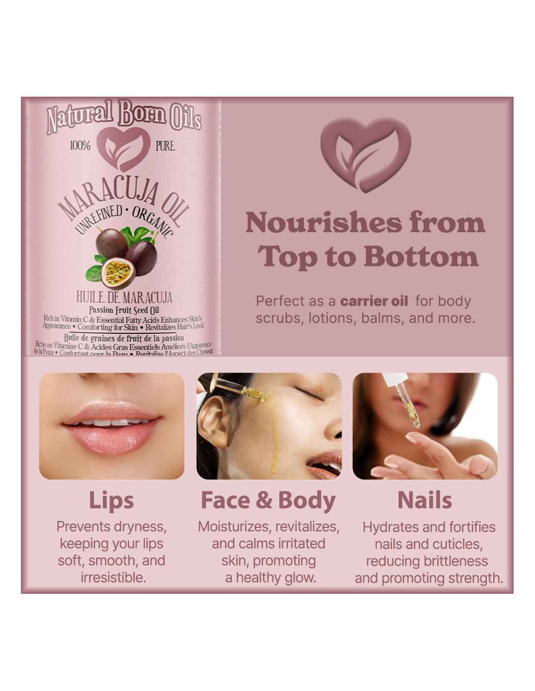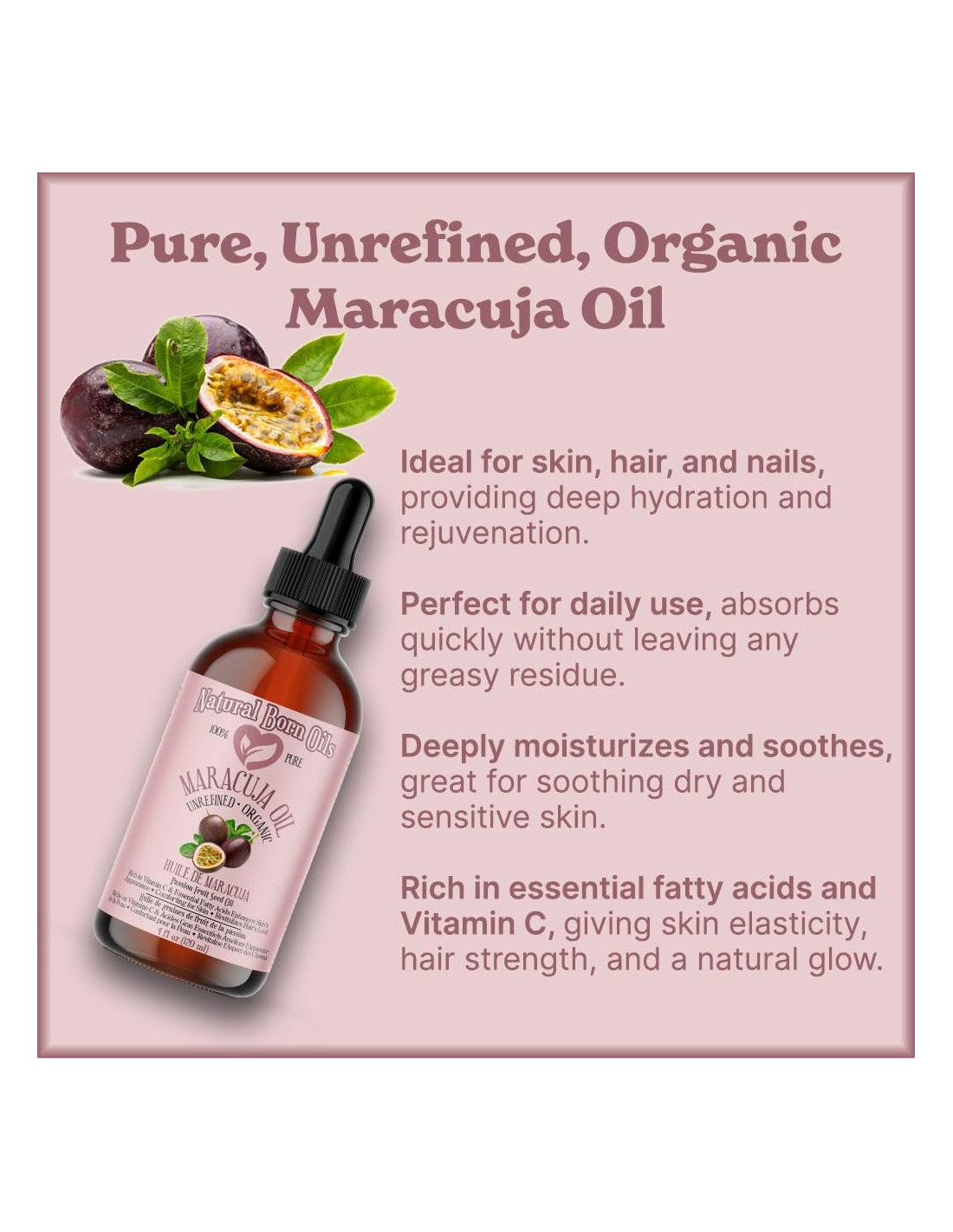 - El Aceite de Maracuja, también conocido como Aceite de Semilla de Fruta de la Pasión, es un poderoso hidratante que deja la piel brillante, fresca y nunca grasosa.