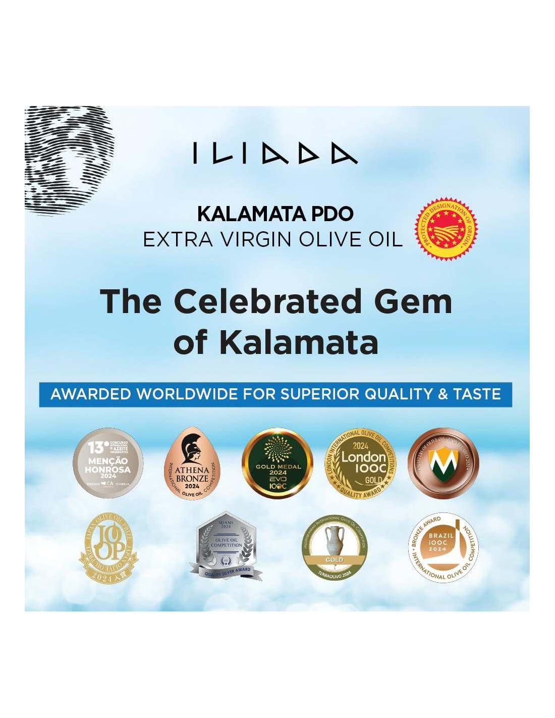 - KALAMATA PDO: Garantiza calidad, autenticidad y trazabilidad a la ciudad de KALAMATA, Grecia. 100% monovarietal, aceituna KORONEIKI no completamente madura, molida dentro de las 24 horas posteriores a la cosecha.
