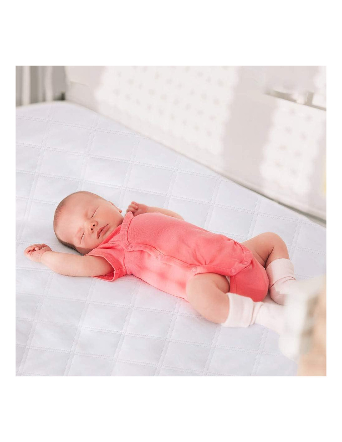 - TEJIDO ACOLCHADO Y SUAVE - Hecho de un tejido suave y transpirable que hace que nuestro protector de colchón de cuna sea cómodo al tacto, especialmente perfecto para la delicada piel del bebé. El proceso acolchado aumenta el flujo de aire y ayuda a regular la temperatura de sueño para crear un ambiente de sueño acogedor.
