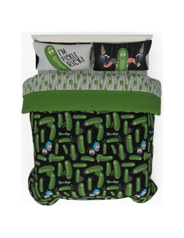 - DISEÑO DE RICK Y MORTY: Lleva el humor y el caos de Rick y Morty a tu dormitorio con este audaz y entretenido juego de cama que presenta a Pepinillo Rick y personajes favoritos de los fanáticos.
